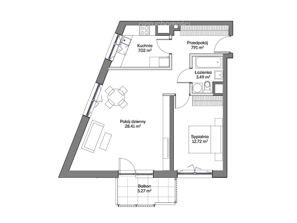 salonu (28,41 m²)kuchni (7,02 m²)sypialni (12,72 m²)łazienki (3,49