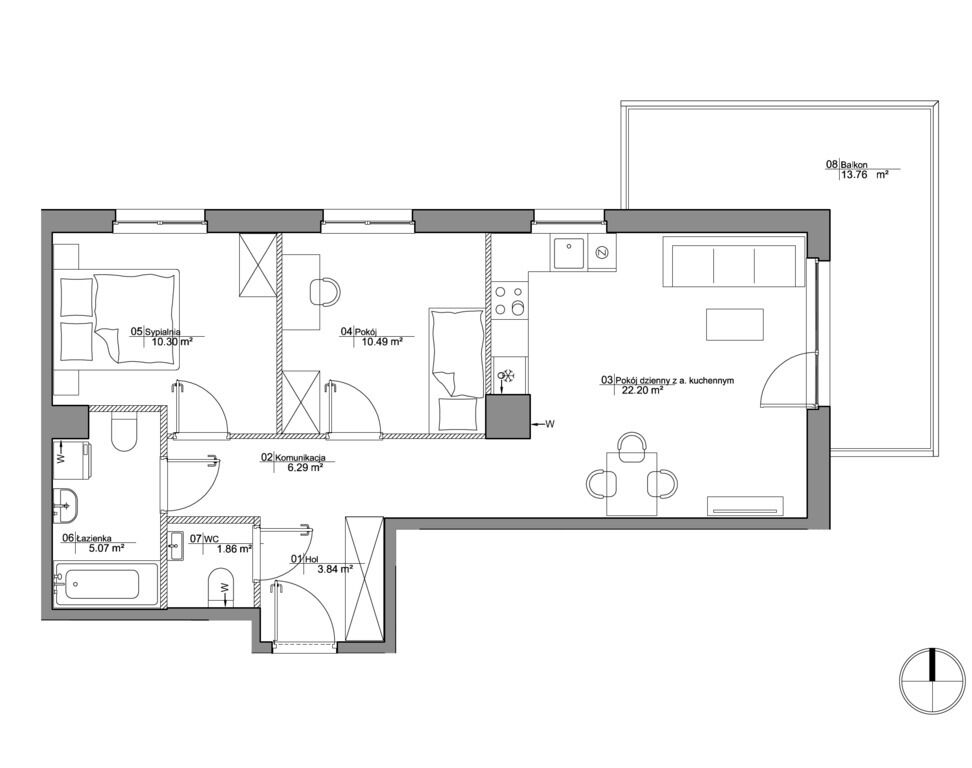 salonu z aneksem (22,20m²) 2 pokoi (10,49m² + 10,30m²)łazienki