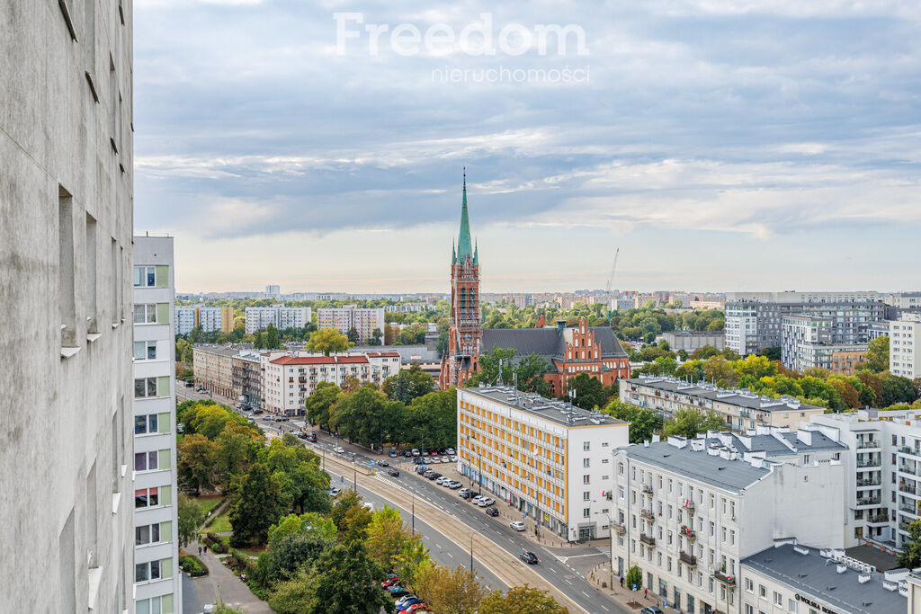balkon z pięknym widokiem na panoramę Warszawy.