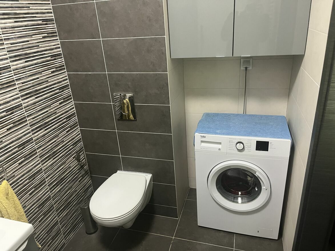 W łazience znajduje się wanna z prysznicem i pralka.