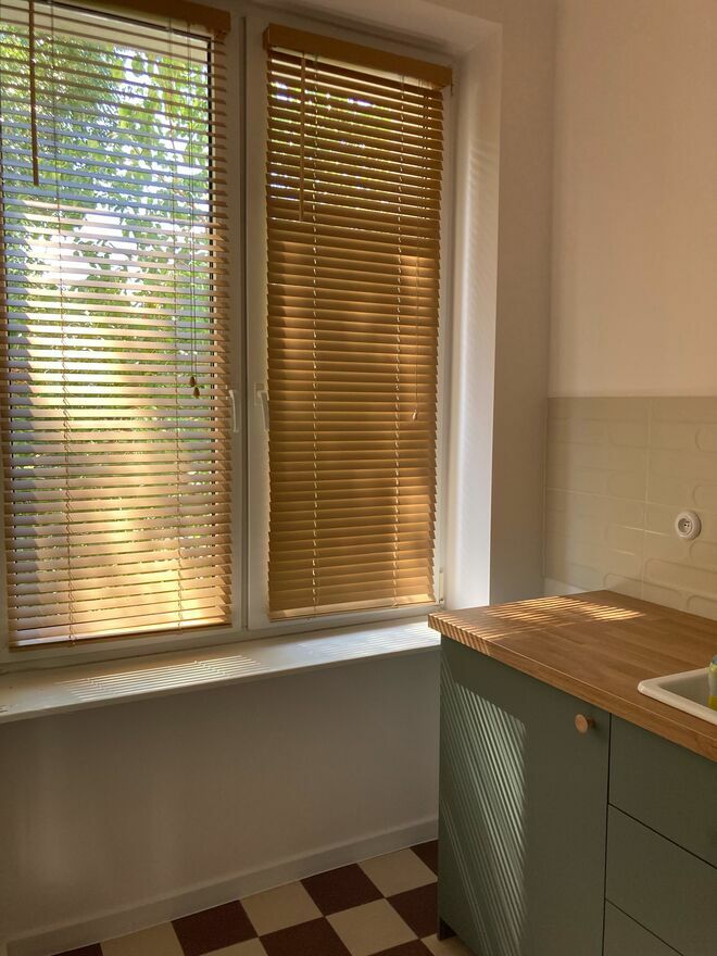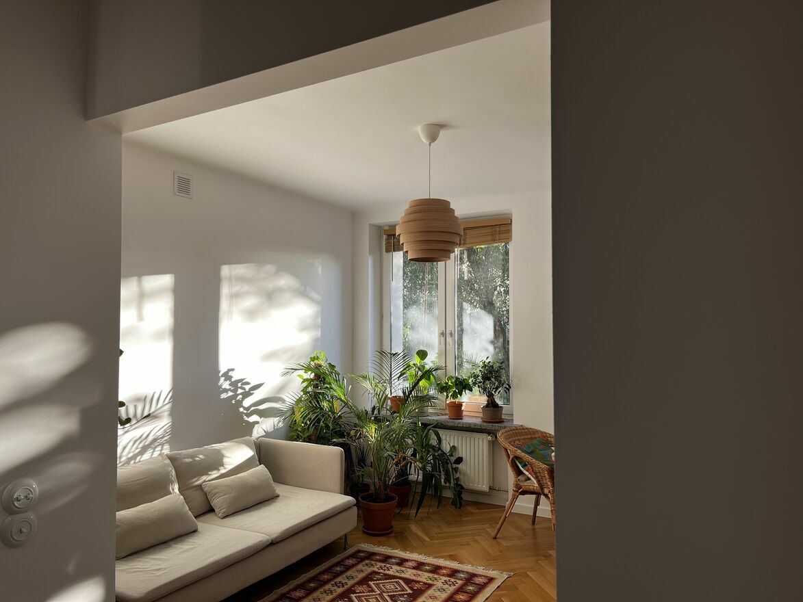Salon z aneksem kuchennym: 20,5 m², jasna, przestronna przestrzeń z widokiem na zieleń. Na podłodze oryginalny parkiet, wycyklinowany. W kuchni gres Paradyż Modernizm, nad blatem kuchennym płytki włoskie Biscuit Avorio. Kuchnia jest w pełni wyposażona: meble IKEA, lodówka Amica Retro, płyta indukcyjna, piekarnik, zmywarka oraz pralko-suszarka Whirlpool.