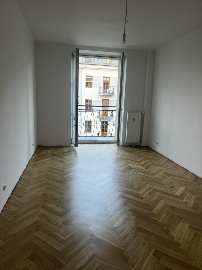 Sypialnia: 18,7 m², przestronna, strona wschodnia, z balkonem oraz widokiem na odrestaurowaną kamienicę, w której mieściła się dawna szkoła żeńska Heleny Rzeszotarskiej.