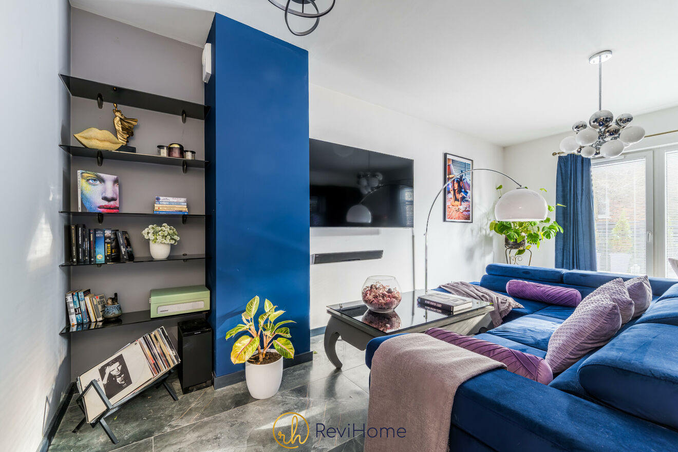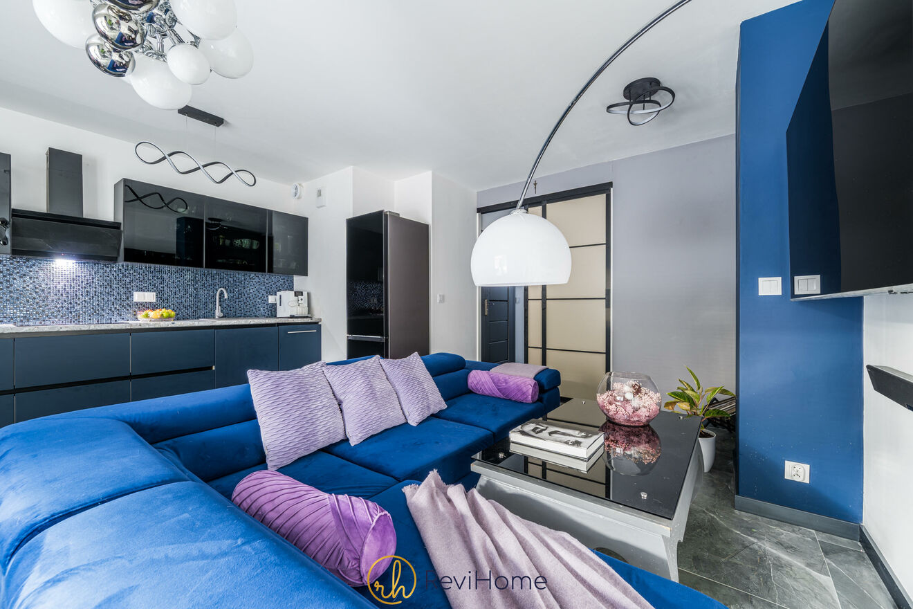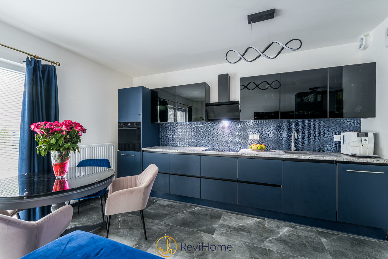 Salon z jadalnią utrzymany w granatowo czarnej kolorystyce połączony jest z aneksem kuchennym w tej samej tonacji, co nadaje spójności i charakteru całemu wnętrzu. Smaku dodaje również nietuzinkowe oświetlenie wnętrza. Znajduje się tu miejsce na wielką kanapę, stolik kawowy oraz półki na książki a także stół jadalniany z krzesłami. Z salonu prowadzi wyjście bezpośrednio na ogród, który jest zagospodarowany w donice, taras wyłożony deskami oraz oczywiście zasiany trawą.