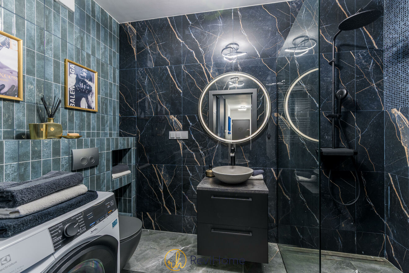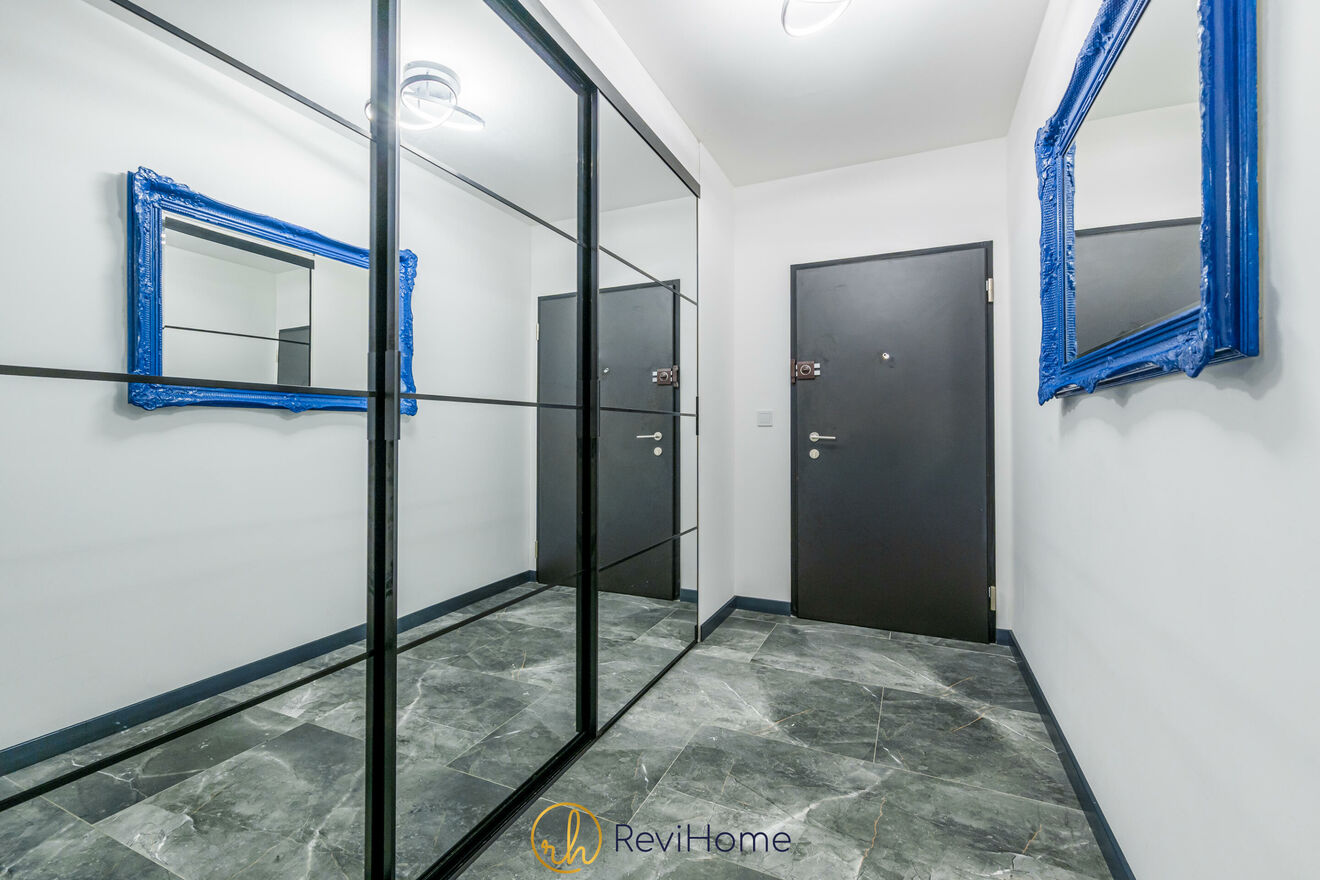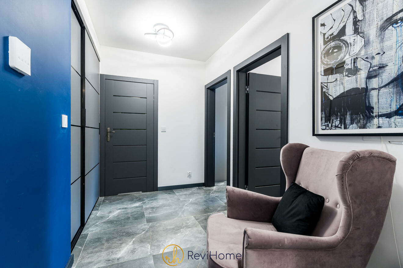 Przestronny i stylowy przedpokój, z którego jest wejście do każdego z pomieszczeń. To tutaj za przesuwnymi drzwiami ukryta jest garderoba. W łazience prysznic typy walk in wielką deszczownicą, pralka oraz szafki.