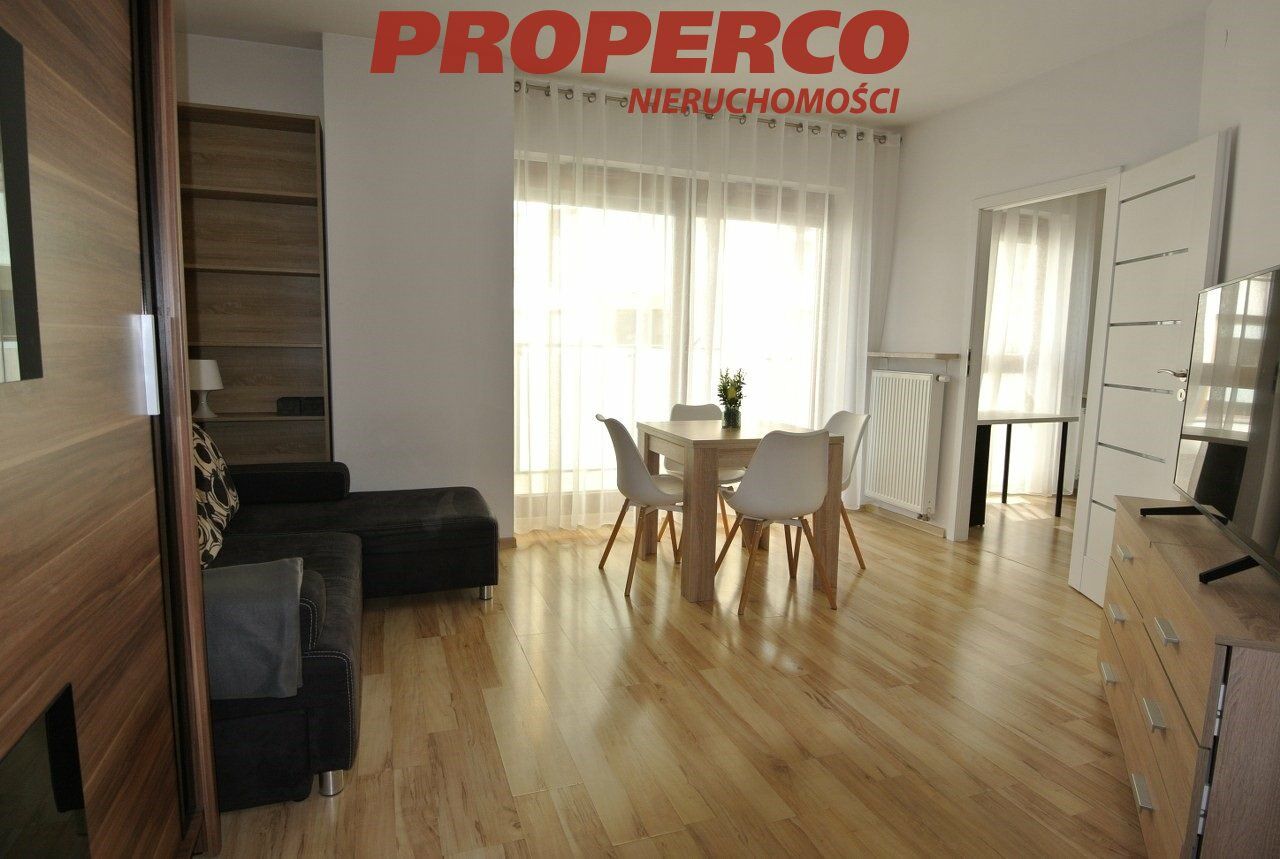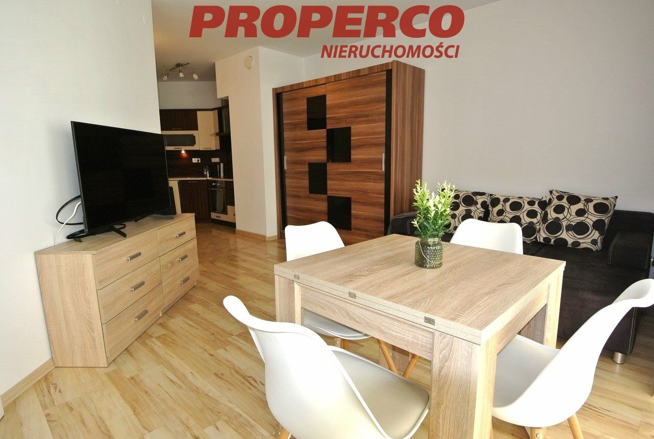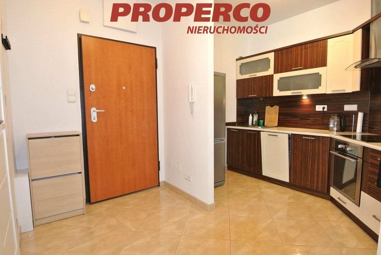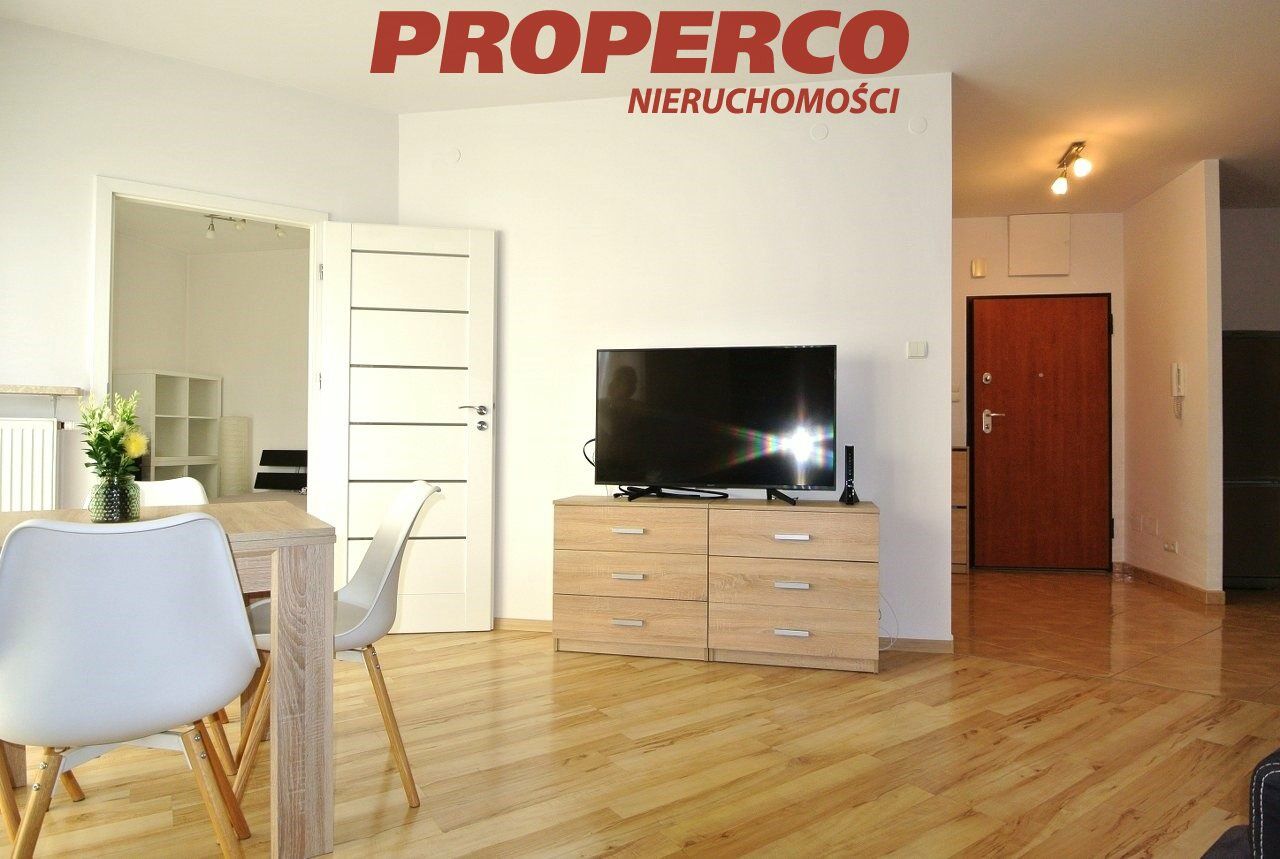 The apartment is situated on the 3rd floor of an 8-storey building from 2008. The layout includes: living room with kitchenette and access to a large balcony, bedroom, bathroom with WC, and hallway. The apartment is fully furnished and equipped with household appliances (washing machine, fridge, dishwasher, oven).