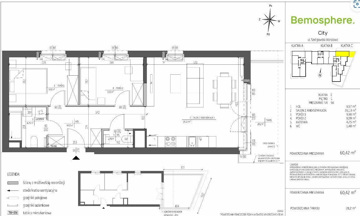 3 - pokojowe mieszkanie o powierzchni 60,42m składające się z salonu z aneksem kuchennym, 2 sypialni i łazienki z Wc zlokalizowane na 1 piętrze w budynku Bemosphere Citi przy ul. Żeńców 11 nieopodal nowo powstającej stacji metra Chrzanów.- 3 pokoje