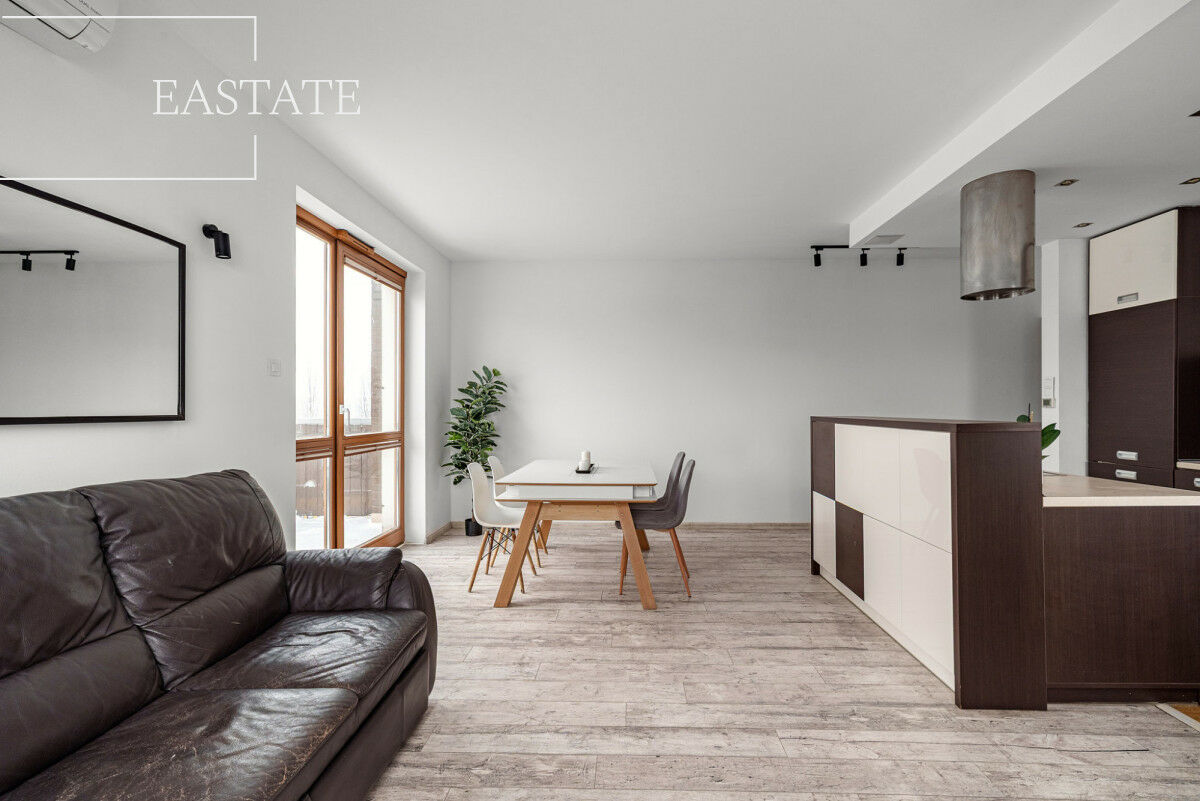 przestronny salon z aneksem kuchennym i wyjściem na balkon,