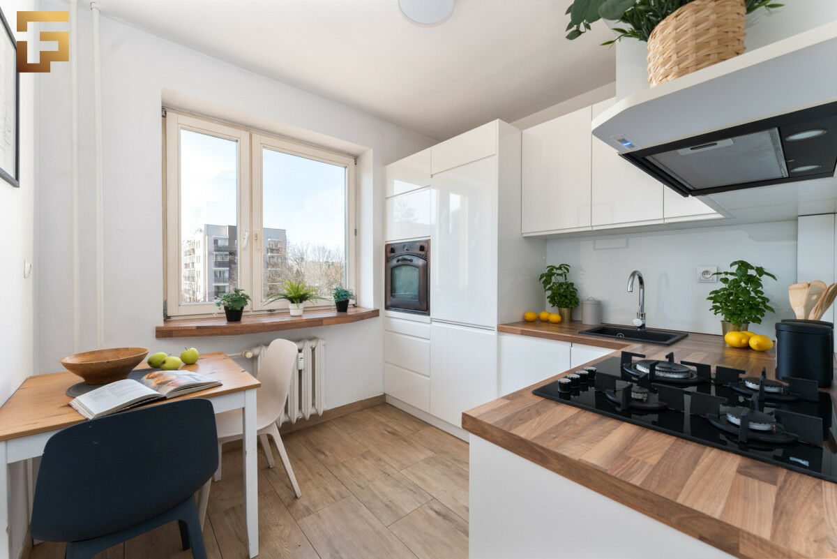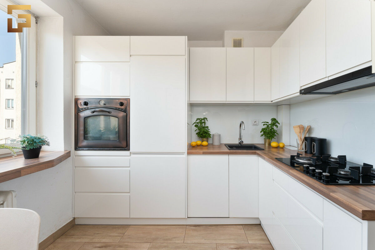 Kuchnia w zabudowie została wykonana w nowoczesnym stylu - białe, minimalistyczne fronty zestawiono z drewnianym blatem, tworząc elegancką i ciepłą przestrzeń. Planując generalny remont nieruchomości można zachować oryginalny układ, lub przenieść kuchnię do salonu, tworząc w tym miejscu drugą sypialnie.