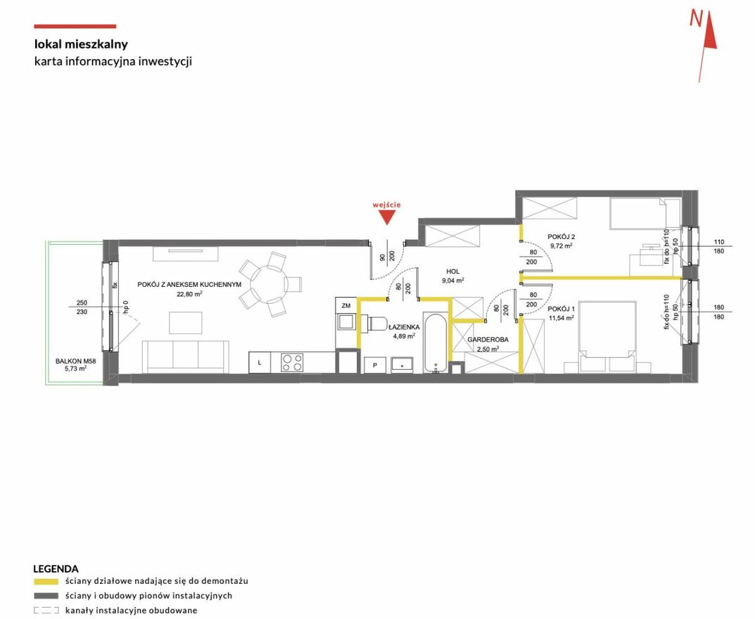 dwóch pokoi (11,54 m² i 9,72 m²),