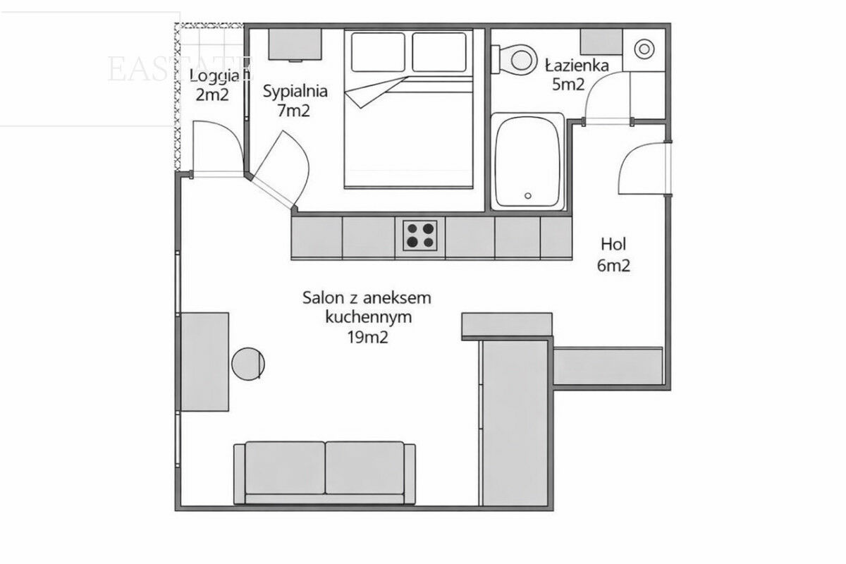 Układ: salon z aneksem kuchennym, sypialnia, łazienka, przedpokój