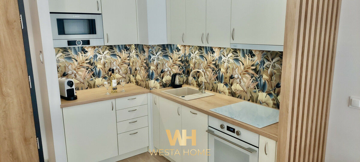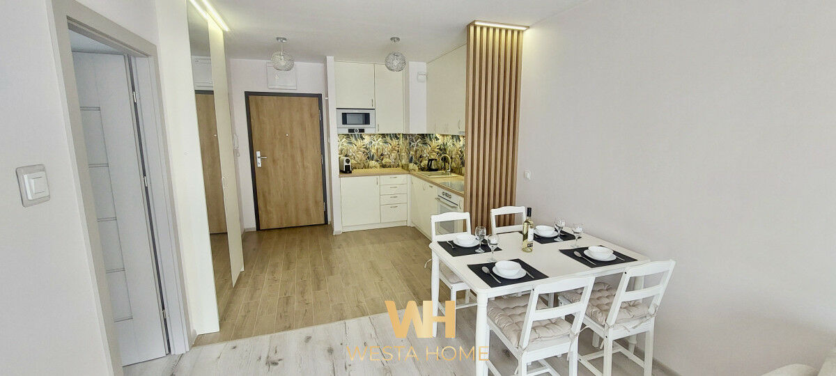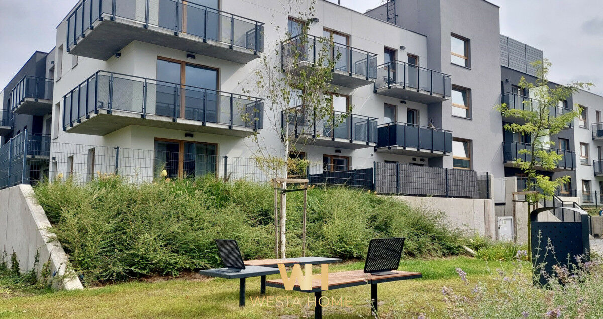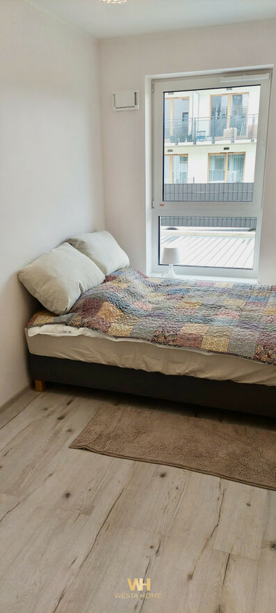 Oferowane mieszkanie jeszcze nigdy nie było zamieszkane. Jest bardzo widne. Jego wnętrze jest urządzone w wysokim standardzie w jasnych i stonowanych kolorach. Osiedle jest monitorowane i objęte ochroną 24h/dobę. Wewnątrz osiedla znajdziemy: tereny rekreacyjne, ławeczki, place zabaw, trawniki, klomby i dużo zieleni.