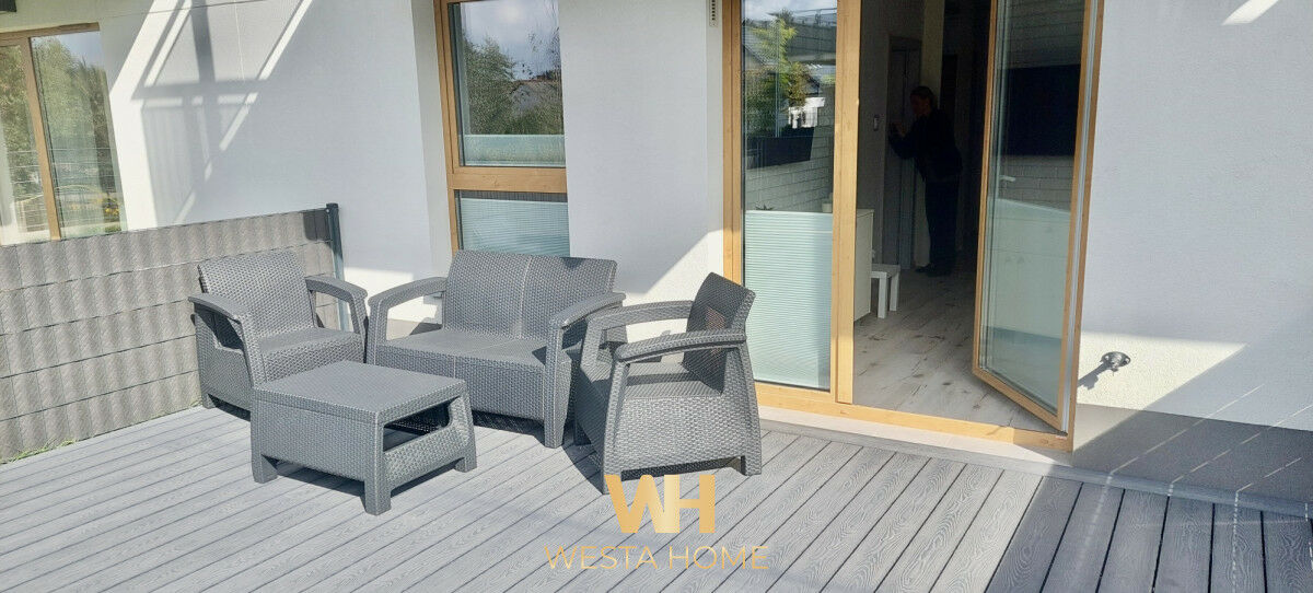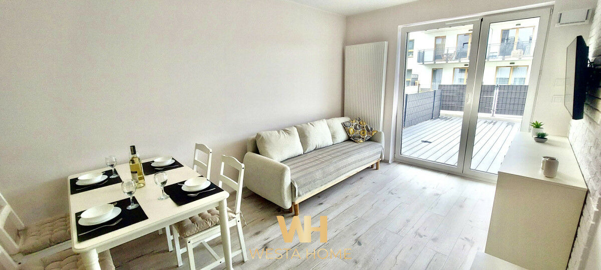 Na wynajem nowe 2 pokoje z aneksem kuchennym i dużym tarasem. Mieszkanie o wysokim standardzie, jeszcze nigdy nie używane w pełni umeblowane i wyposażone.Cena: