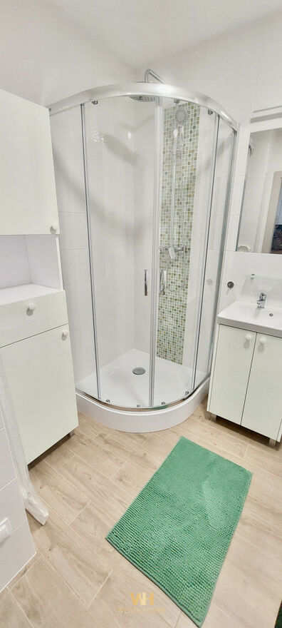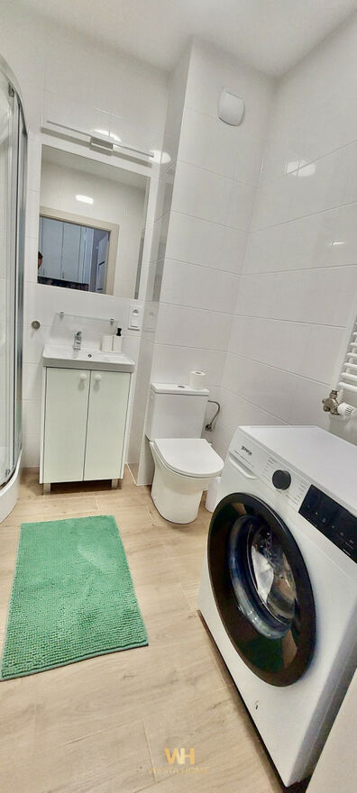Kabina prysznicowa, pralka, duże podświetlane lustro, szafki.
