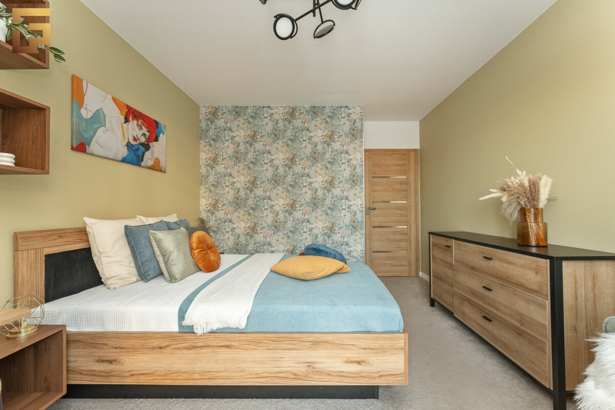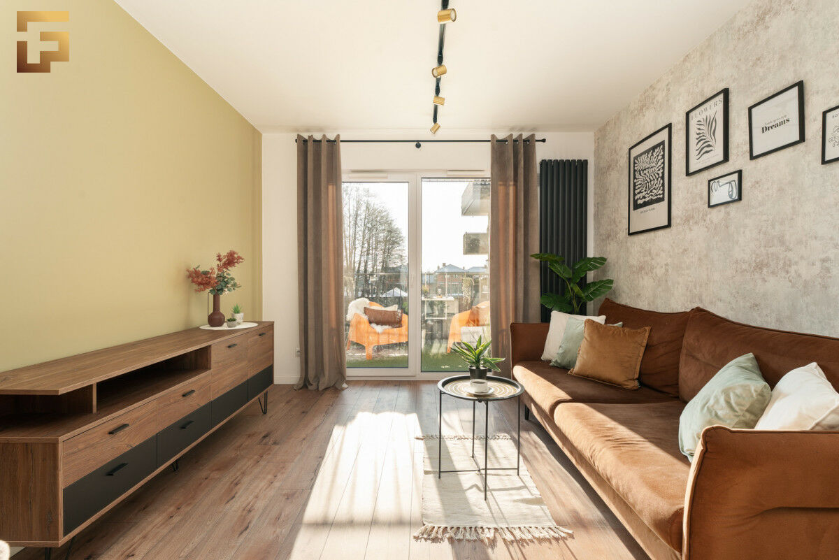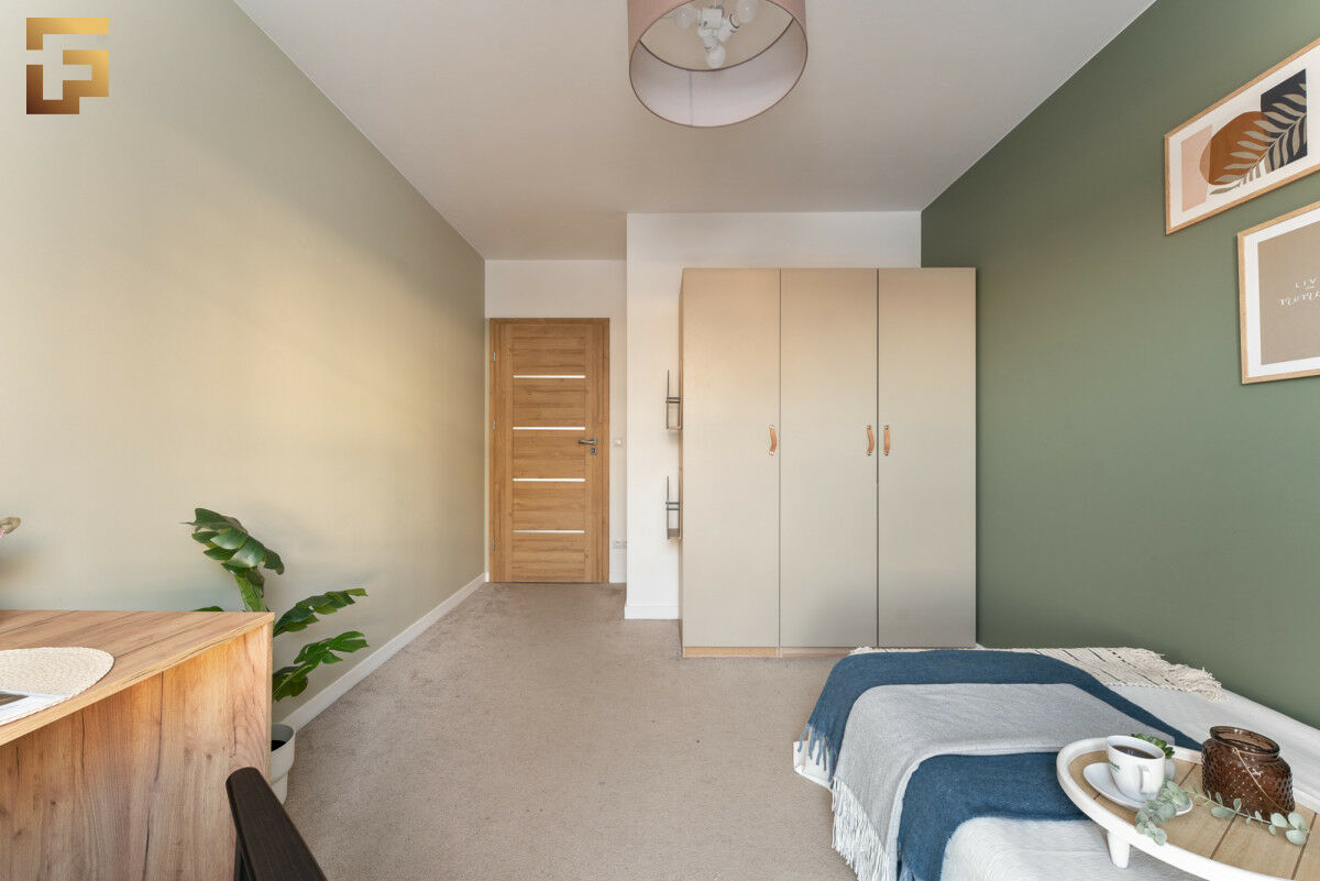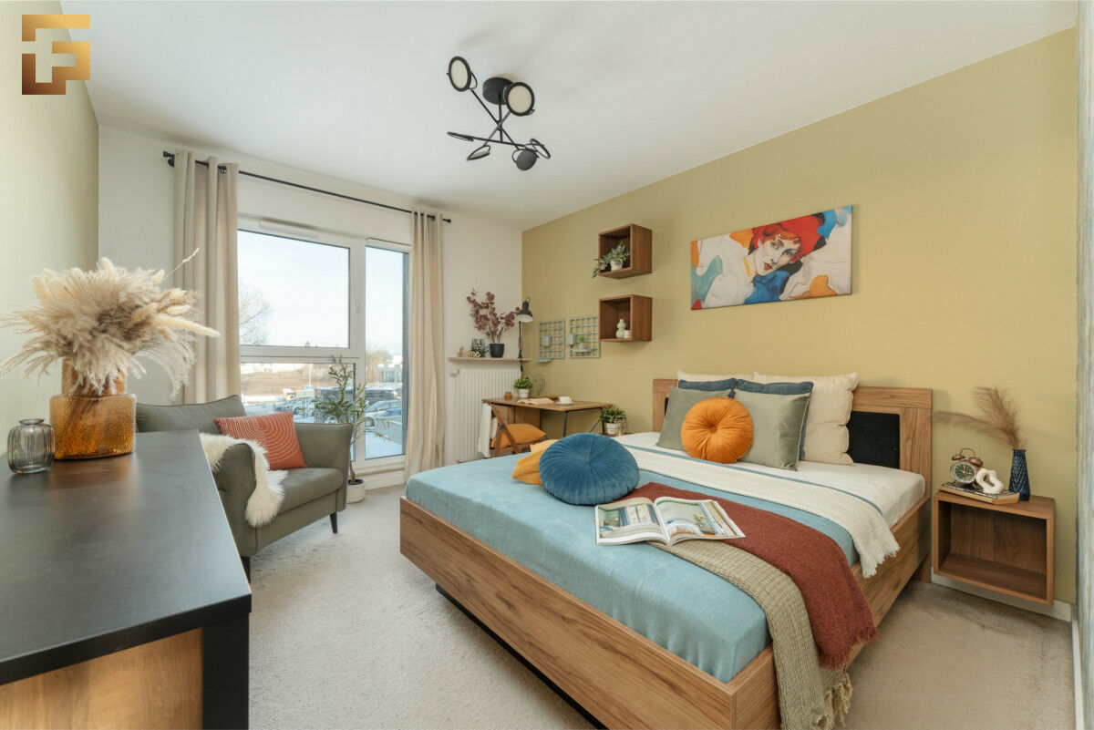 Przestronny salon z otwartą kuchnią skierowany jest na południe, dzięki czemu pomieszczenie jest doskonale doświetlone. Z salonu mamy wyjście na balkon, który pomieści 4 osoby. Sypialnia utrzymana jest w harmonijnej stylistyce, co sprzyja wyciszeniu i komfortowi. Centralnym punktem pomieszczenia jest wygodnych rozmiarów łóżko uzupełnione o stoliki nocne. W pomieszczeniu znajduje się również biurko do pracy.