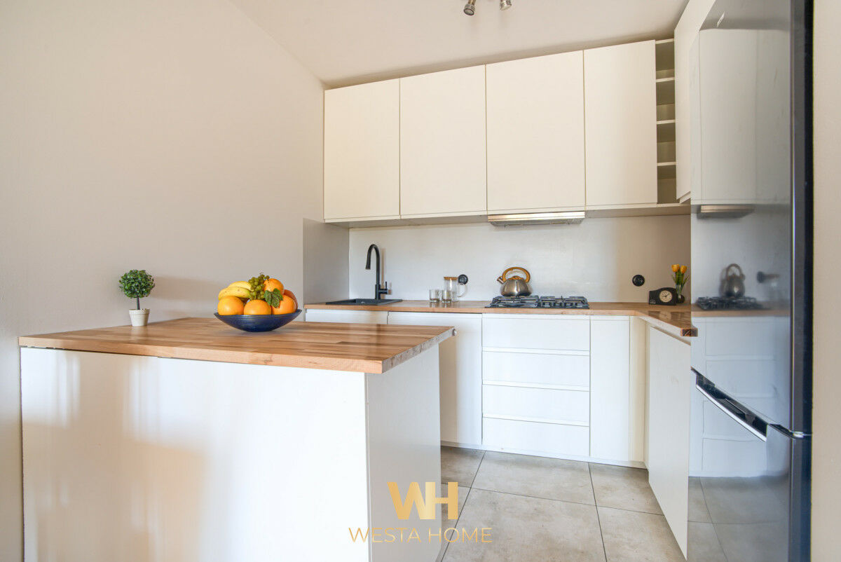 Kuchnia w pełni wyposażona: płyta gazowa, okap, nowa lodówka, zmywarka oraz kuchenka mikrofalowa. Duży blat roboczy z wyspą i liczne szafki zapewniają dużo miejsca do gotowania i przechowywania.