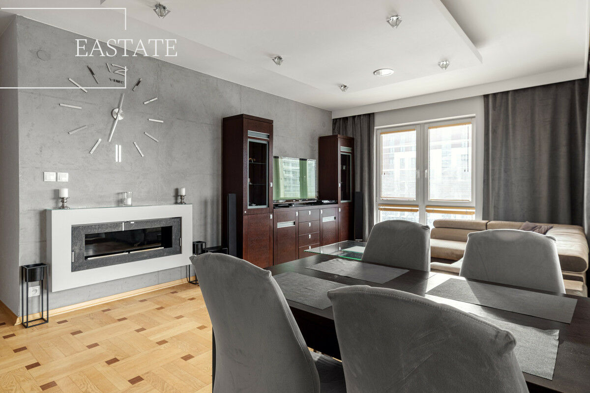 - Pokój dzienny z aneksem kuchennym, strefą jadalną i przestrzenią wypoczynkową. W pokoju zamontowana jest klimatyzacja, kominek na biopaliwo, położony jest drewniany parkiet, ekspozycja na południowy zachód,