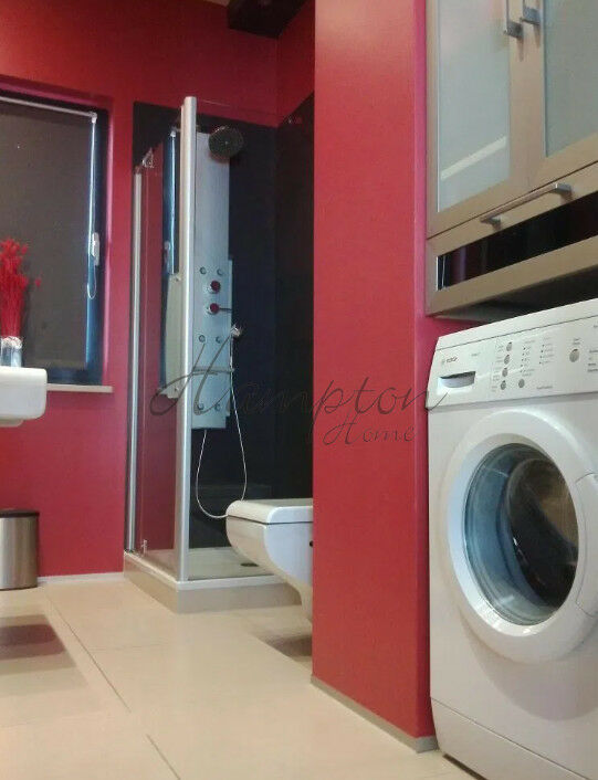 - łazienka z kabiną prysznicową, pralką, podświetlanym lustrem oraz oknem