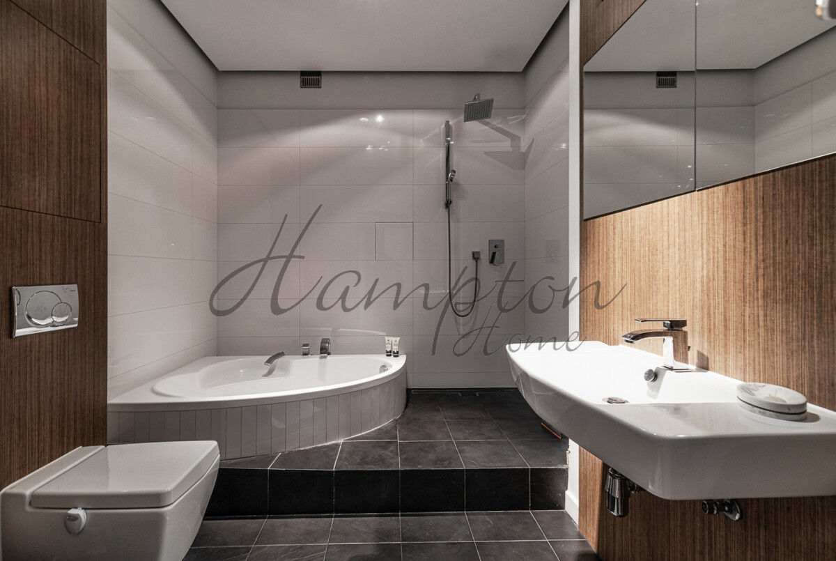W apartamencie znajduje się ponadto duża łazienka z prysznicem i wanną oraz toaleta dla gości wraz z zapleczem pralniano-gospodarczym.
