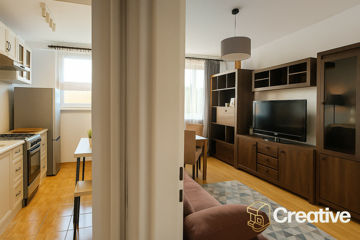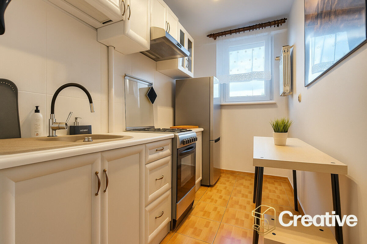 Kuchnia z pełnym wyposażeniem - funkcjonalna, ze wszystkimi niezbędnymi sprzętami, gotowa do codziennego użytku bez dodatkowych nakładów.