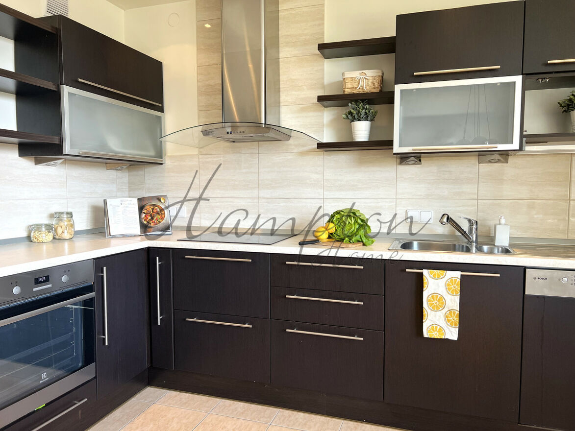 * Oddzielna duża kuchnia (16m2) ze stołem jadalnym. Kuchnia jest w pełni wyposażona w sprzęt AGD - lodówka, zmywarka, okap, piekarnik, płyta grzewcza (głównie firmy Bosch). Dodatkowo na wyposażeniu lodówka na wino.