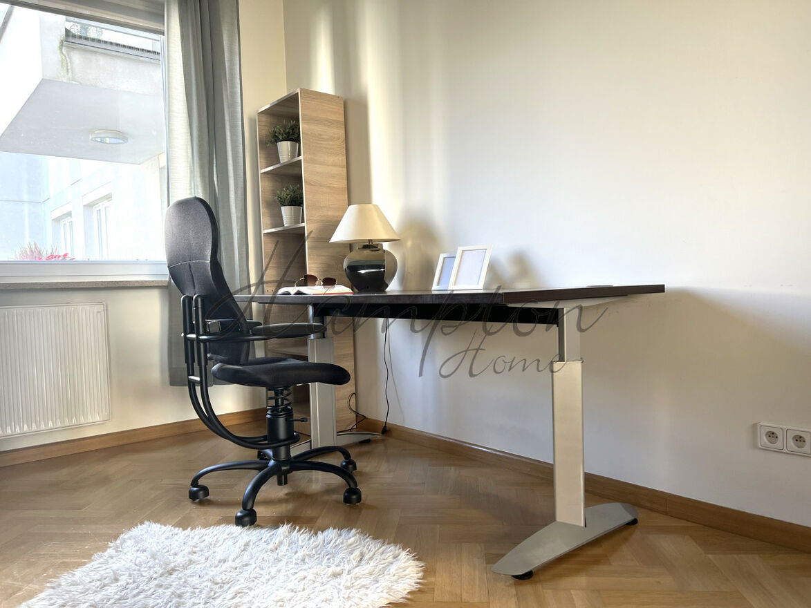 Apartament ma wyraźny podział na część dzienną (salon, kuchnia, garderoba, wc, pokój gościnny) oraz część nocną (sypialnia z przylegającą łazienką, gabinet).