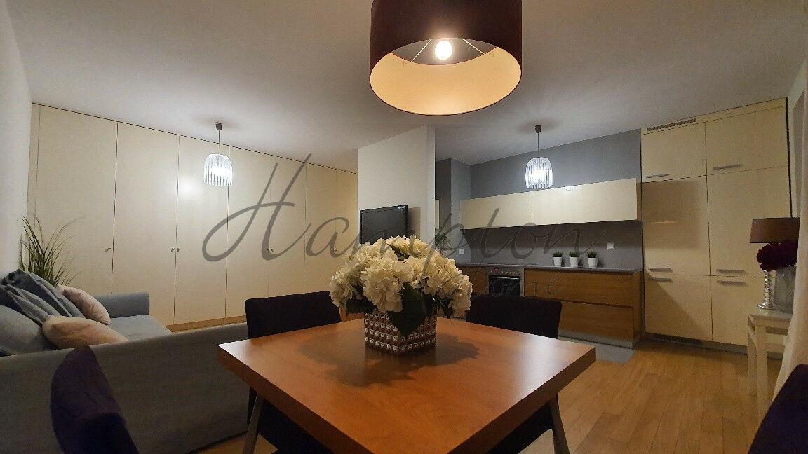 The apartment has been designed in a very functional layout. A spacious living room with direct access to the terrace is connected to a kitchenette. The bedroom offers comfort and privacy, while numerous large built in wardrobes provide exceptional storage space. The apartment is fully furnished and equipped with high quality household appliances. The interior is bright, well kept and ready to move in.