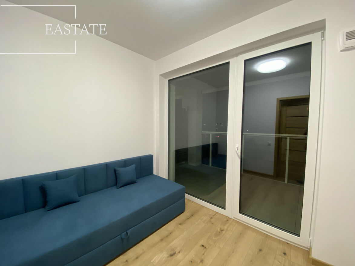 - Pokój dzienny z aneksem kuchennym, rozkładaną kanapą i wyjściem na przestronną loggię z widokiem na patio.