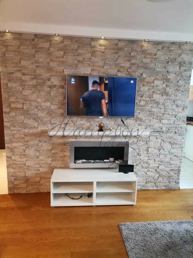 W mieszkaniu znajduje się ściana z bio-kominkiem na miłe wieczory.