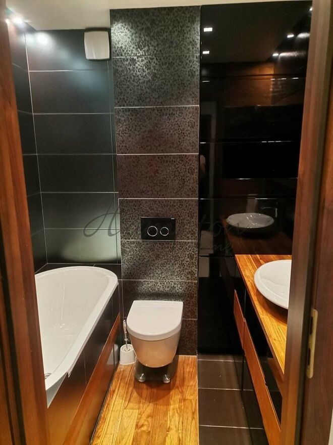 Wysoki standard wykończenia. Na podłodze w całym mieszkaniu deski - parkiet dębowy. Łazienka - podłogi, ściana wykończone w drewnie, podgrzewa podłoga, wanna, umywalka, sedes - Villeroy Boch.