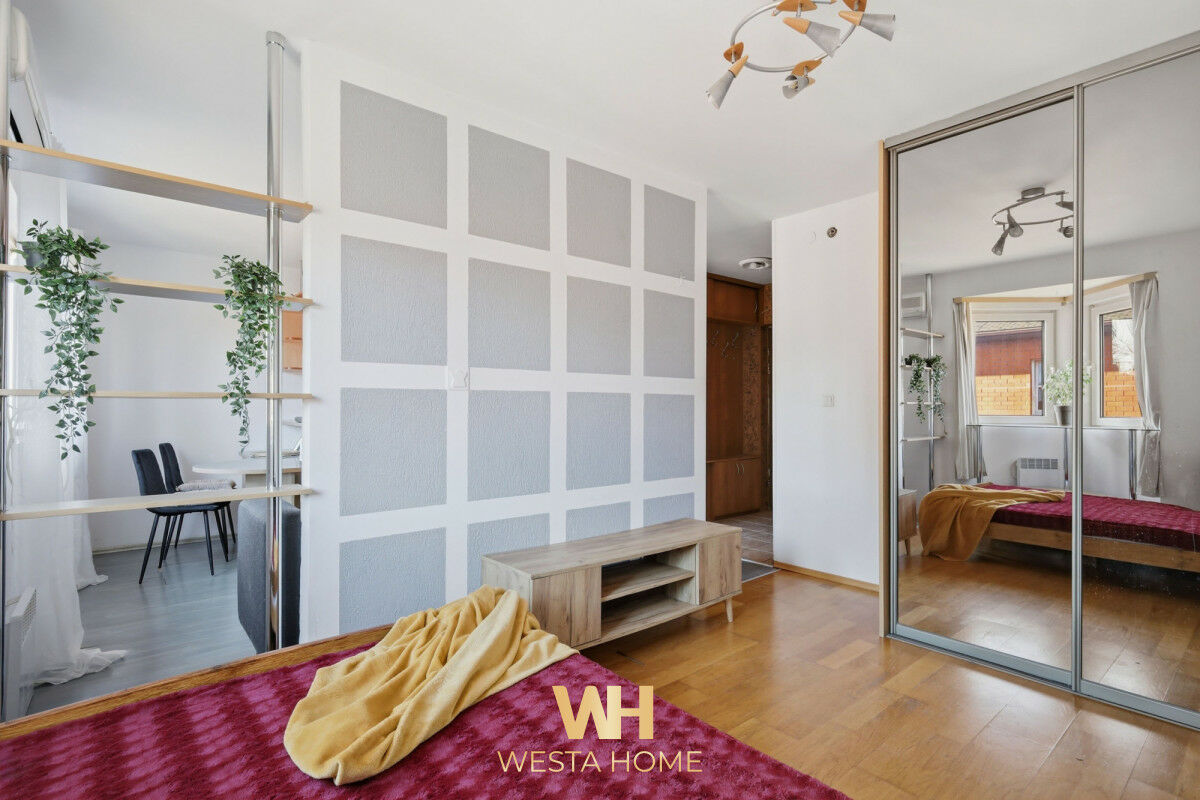 Sprzedam przestrzenną kawalerkę 34m² z klimatyzacją, położoną na zamkniętym, zielonym i cichym osiedlu przy ul. Augustówka (styk Mokotowa i Wilanowa), ogrzewanie elektryczne, mieszkanie do odświeżenia, własnej aranżacji. Miejsce parkingowe w cenie.Układ pomieszczeń:
