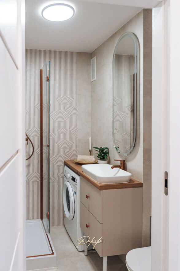 zabudowa kuchenna, płyta elektryczna, okap, pralka oraz kompletna łazienka