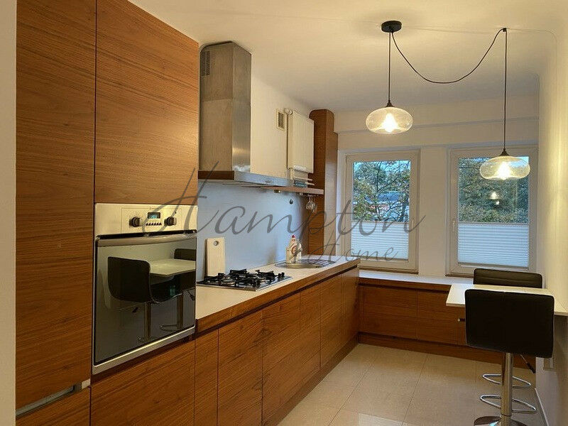 oddzielnej, dużej kuchni (ok. 10 m²) z zabudową na wymiar w fornirze orzechowym oraz pełnym wyposażeniem AGD (zmywarka, piekarnik, pralka, lodówka),