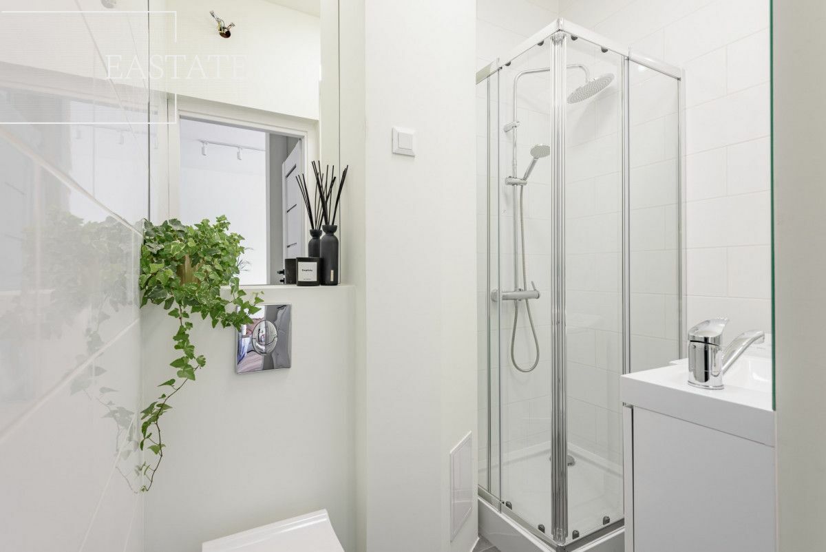 - łazienka z prysznicem, toaletą, pralką i umywalką,