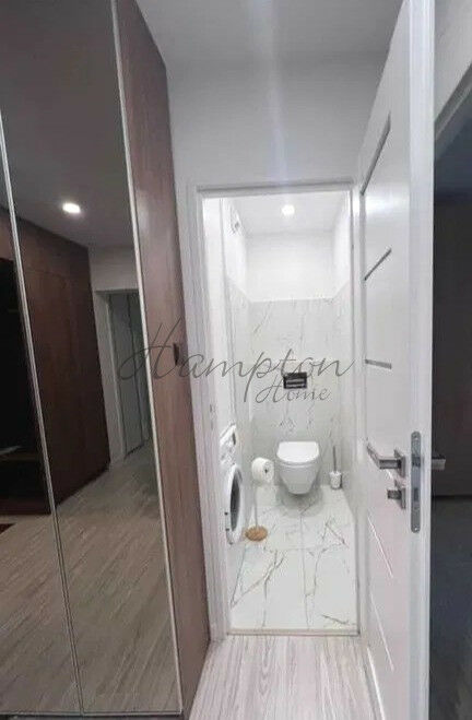 W łazience wanna, w toalecie wc i pralka. Na ścianach do połowy i na podłodze płytki.