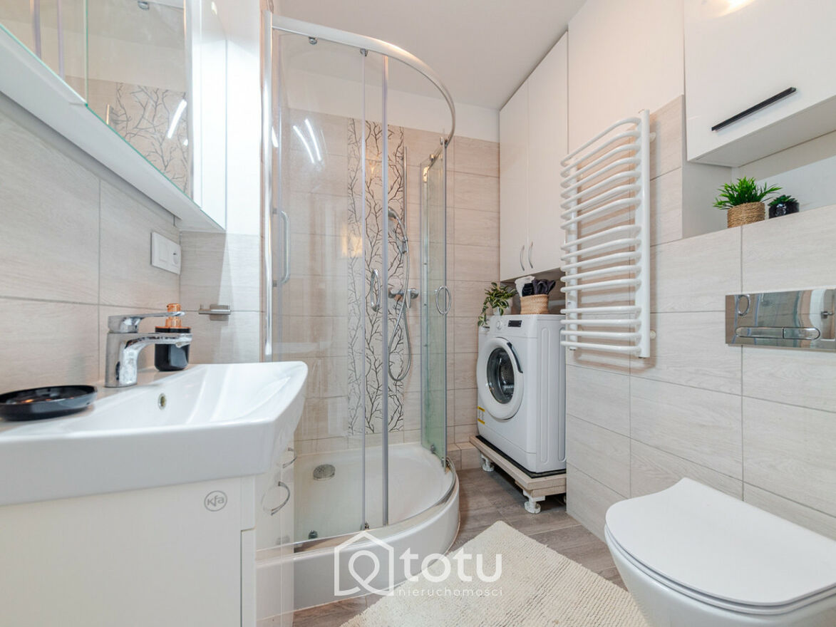W łazience: kabina prysznicowa, pralka, 4 szafki
