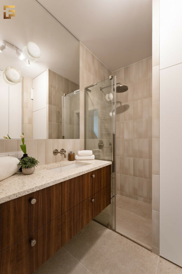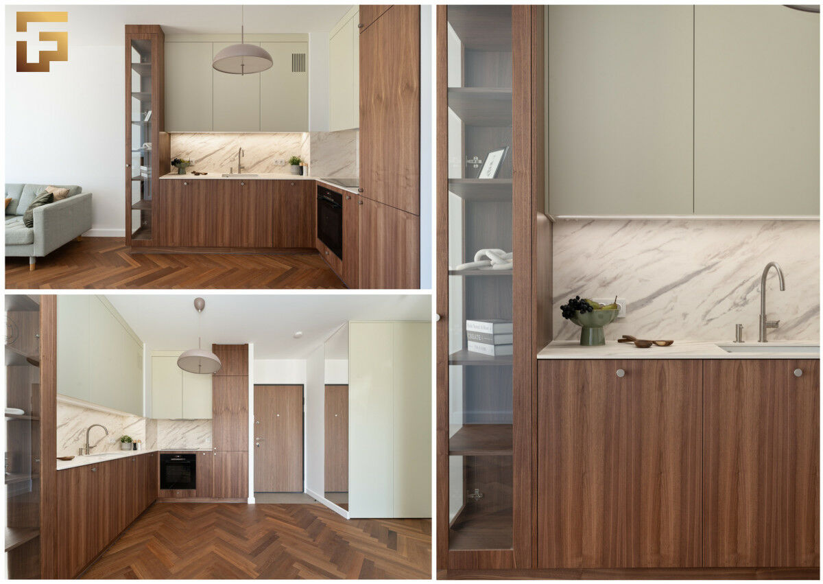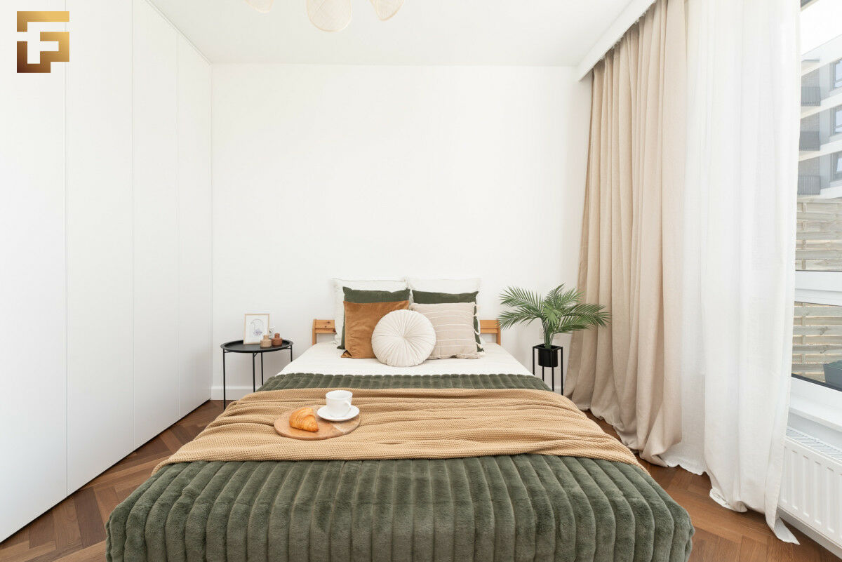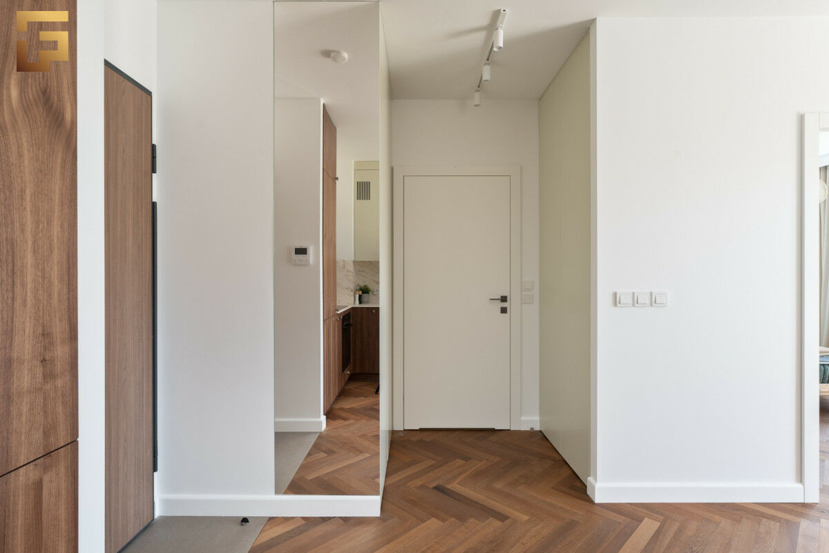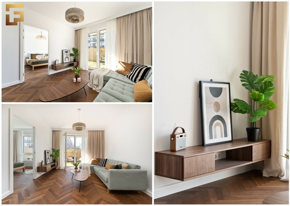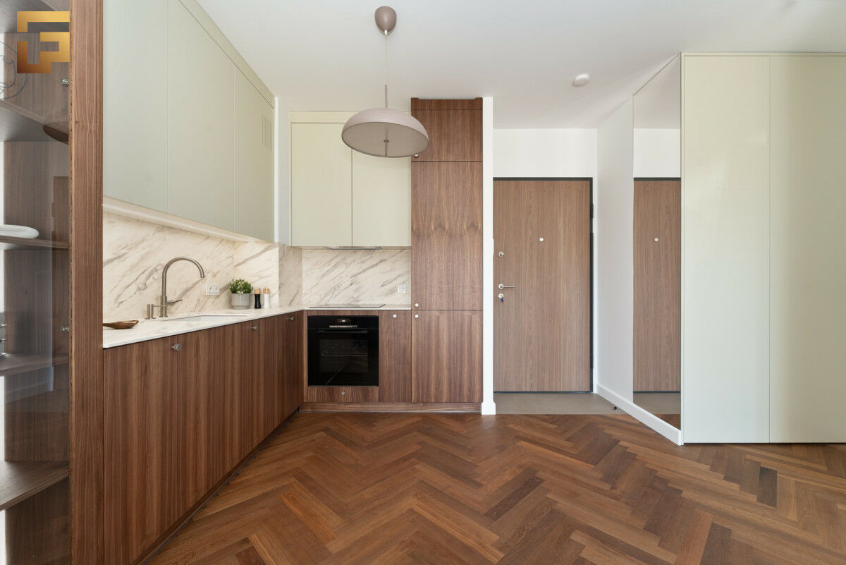 Mieszkanie zostało wykończone przy użyciu wysokiej klasy materiałów. Na podłodze w pokojach oraz kuchni mamy podłogę drewnianą, a dokładnie jest to piękny dąb w kolorze prime caffee. Blat w łazience to włoskie Terrazzo, do tego armatura marki Laufen oraz kabina prysznicowa Radaway. Lustro ozdabiają eleganckie kinkiety, wykonane z ręcznie z dmuchanego szkła. Meble kuchenne zostały zaprojektowane i wykonane na wymiar, jest to fornir z drewna orzecha amerykańskiego. Całej konstrukcji dopełnia kompaktowy blat z podwieszanym jednokomorowym zlewozmywakiem marki Villeroy Boch. Sprzęt AGD w zabudowie to w przeważającej części marka Bosch oraz cicha lodówka firmy Whirlpool. W przedpokoju oraz sypialni znajdują się piękne szafy w zabudowie, dzięki który w mieszkaniu jest dużo miejsca do przechowywania.