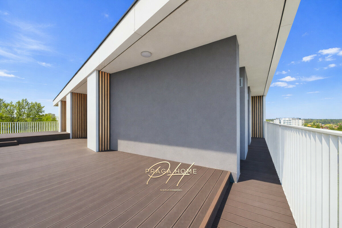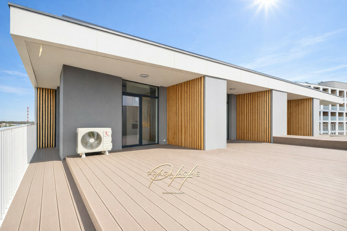 Ogromnym atutem nieruchomości jest taras o powierzchni aż 90 m², dostępny zarówno z salonu, jak i z trzech sypialni. To idealna przestrzeń do relaksu, spotkań z rodziną czy spędzania czasu na świeżym powietrzu. Taras został wykończony trwałą deską kompozytową odporną na działanie wilgoci, niskich temperatur oraz promieniowania UV, a dodatkowo znajduje się na nim estetycznie zaprojektowany schowek wykończony drewnianymi lamelami.