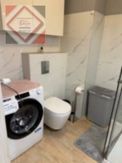 Łazienka z prysznicem, toaletą, umywalką i pralką oraz środki czystości.
