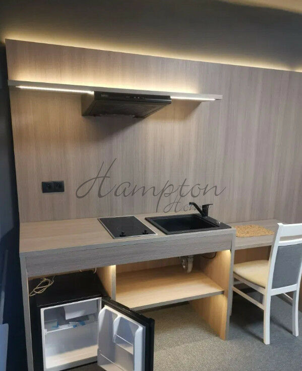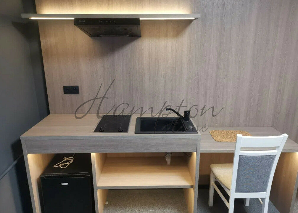aneks kuchenny (płyta indukcyjna z dwoma palnikami, zlewozmywak, okap oraz lodówka)