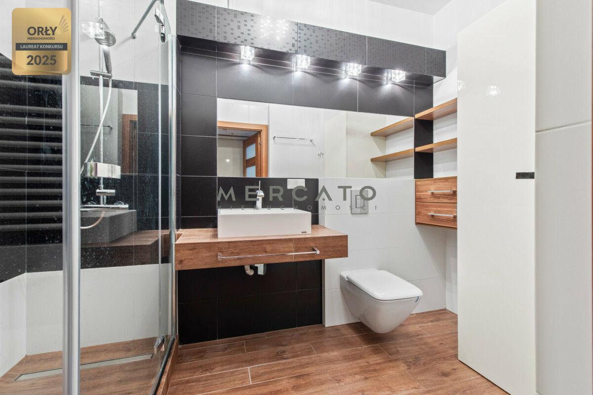 - wysoki standard wykończenia: orzech amerykański, duże formaty płytek, meble na wymiar