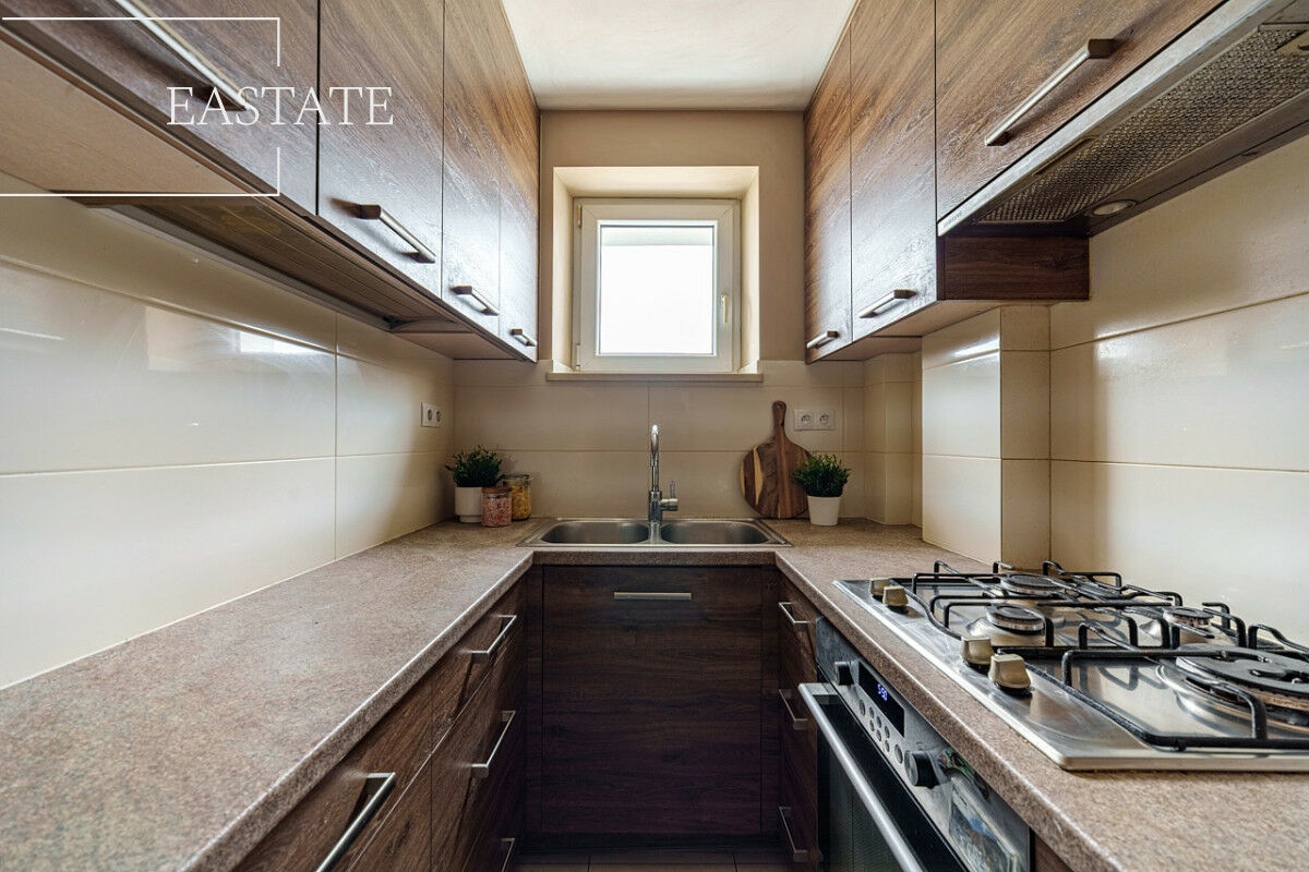 oddzielna kuchnia z oknem i widokiem na Most Świętokrzyski,