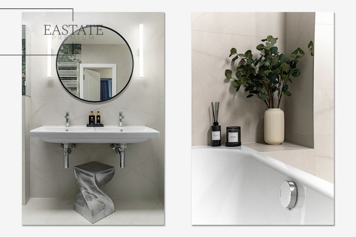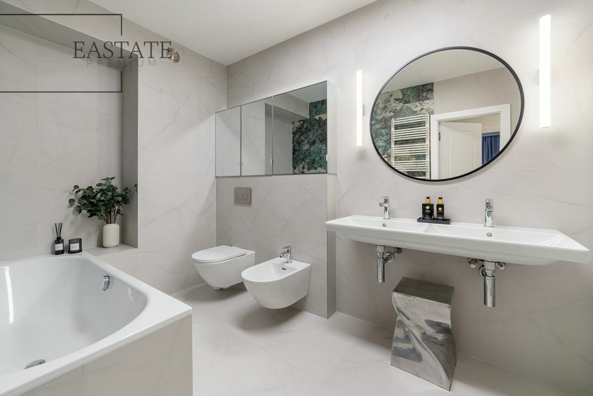Bathrooms: Two elegant bathrooms, designed in a cohesive style, using modern fixtures and high-quality finishing materials. The first bathroom, equipped with a shower, offers functionality and comfort. The second, the main bathroom, spacious and luxurious, features a large bathtub, two sinks, a toilet, and a bidet.