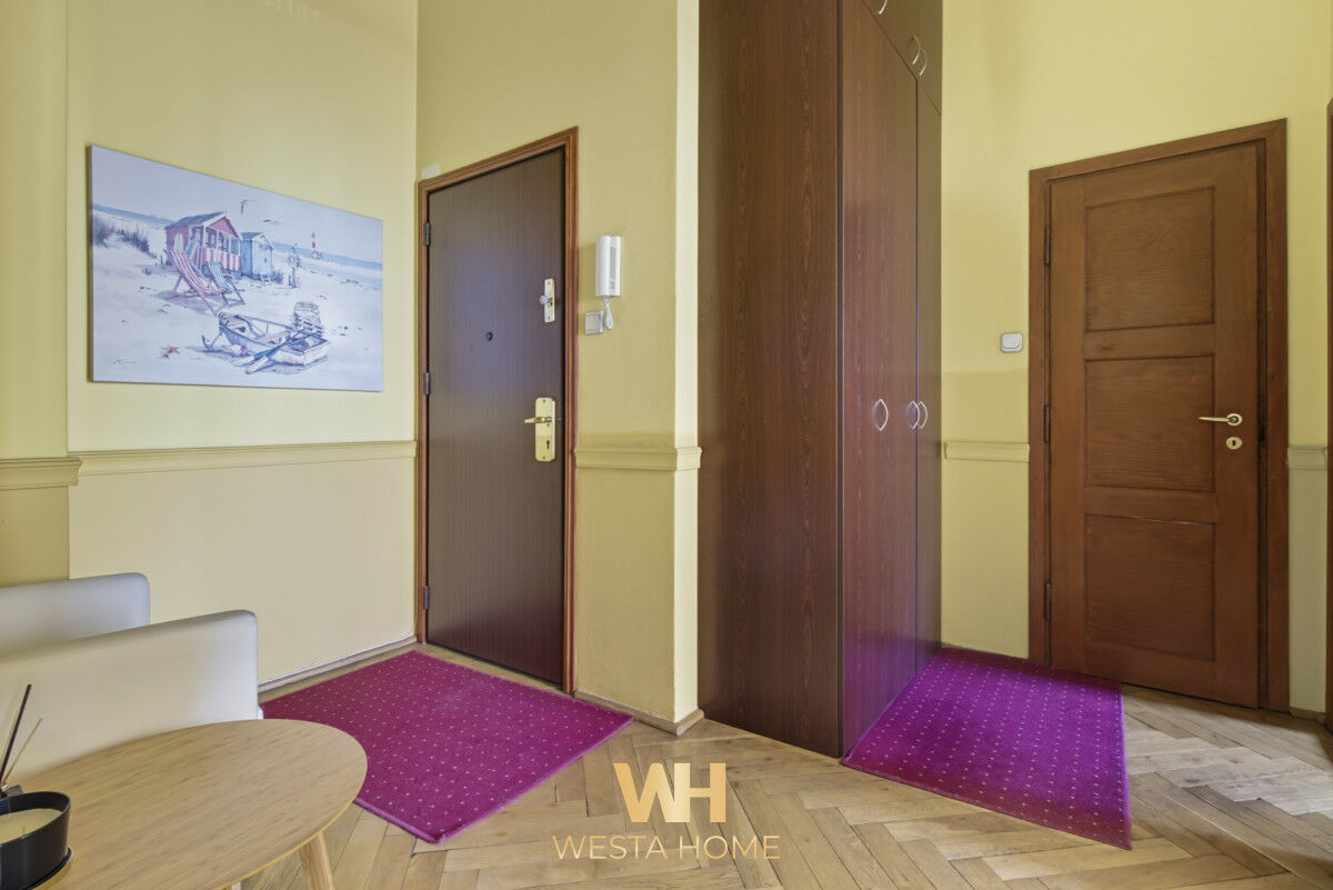 The apartment spans 82 m² and is situated on the first floor. With ceiling heights of 3.30 meters and a range of original features, the space exudes the unique charm and character of a pre-war townhouse. The building has undergone a comprehensive revitalization - all infrastructure has been updated, a new lift has been installed, and the restored large wooden windows enhance its historic appeal. The apartment also boasts oak parquet flooring in excellent condition. Both the apartment and common areas have a pleasant, neutral scent that is rarely found in older buildings.