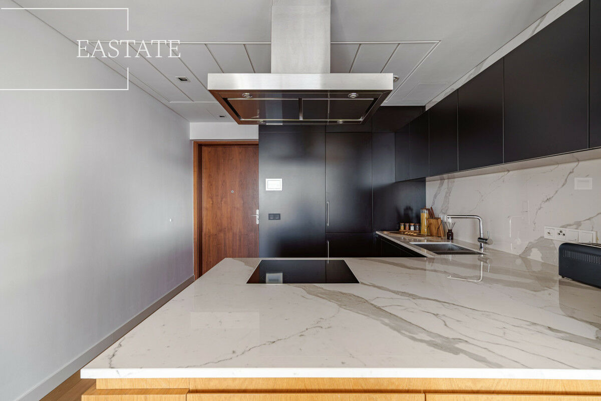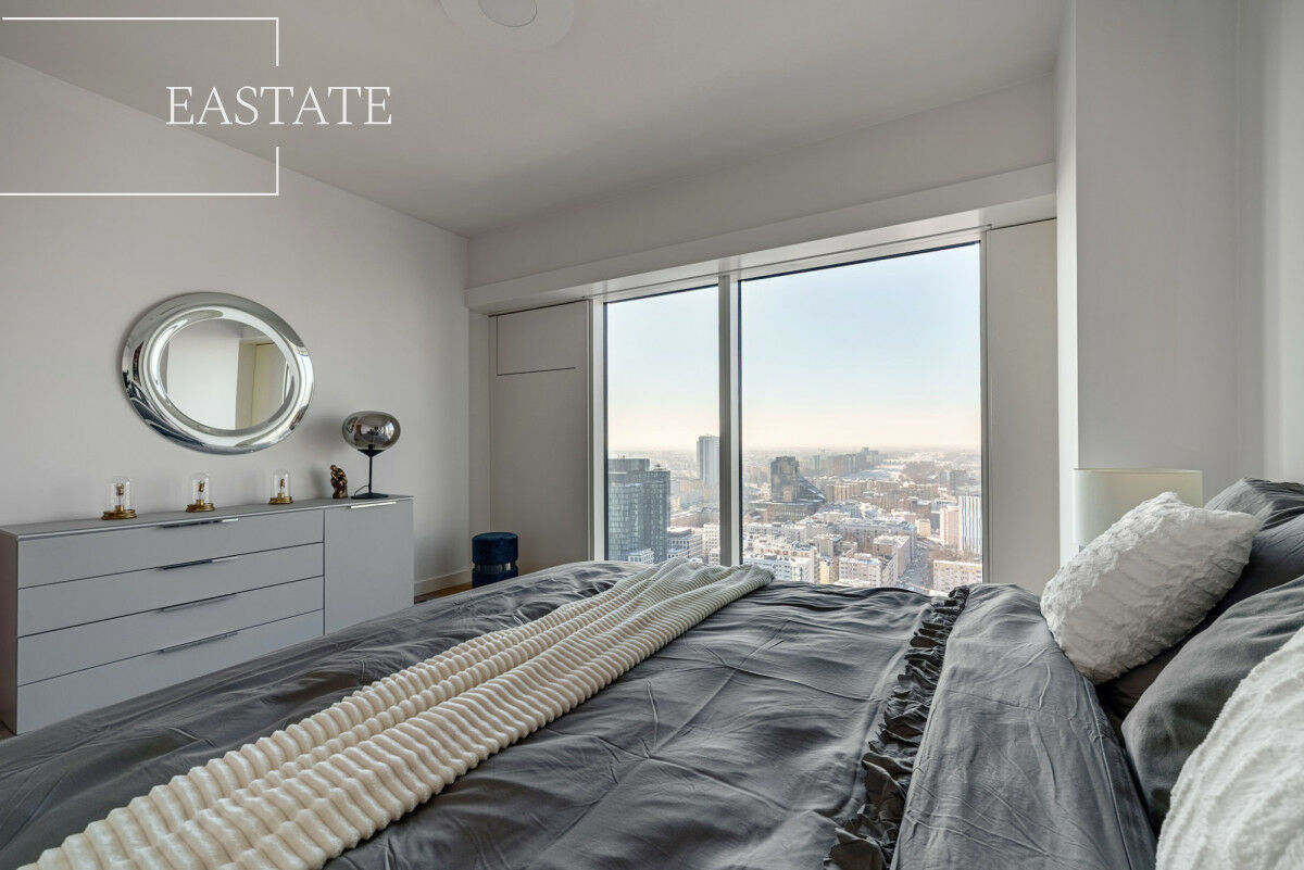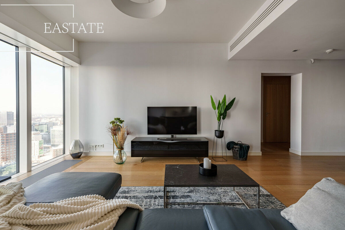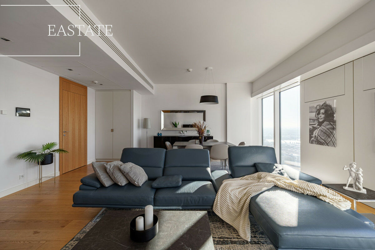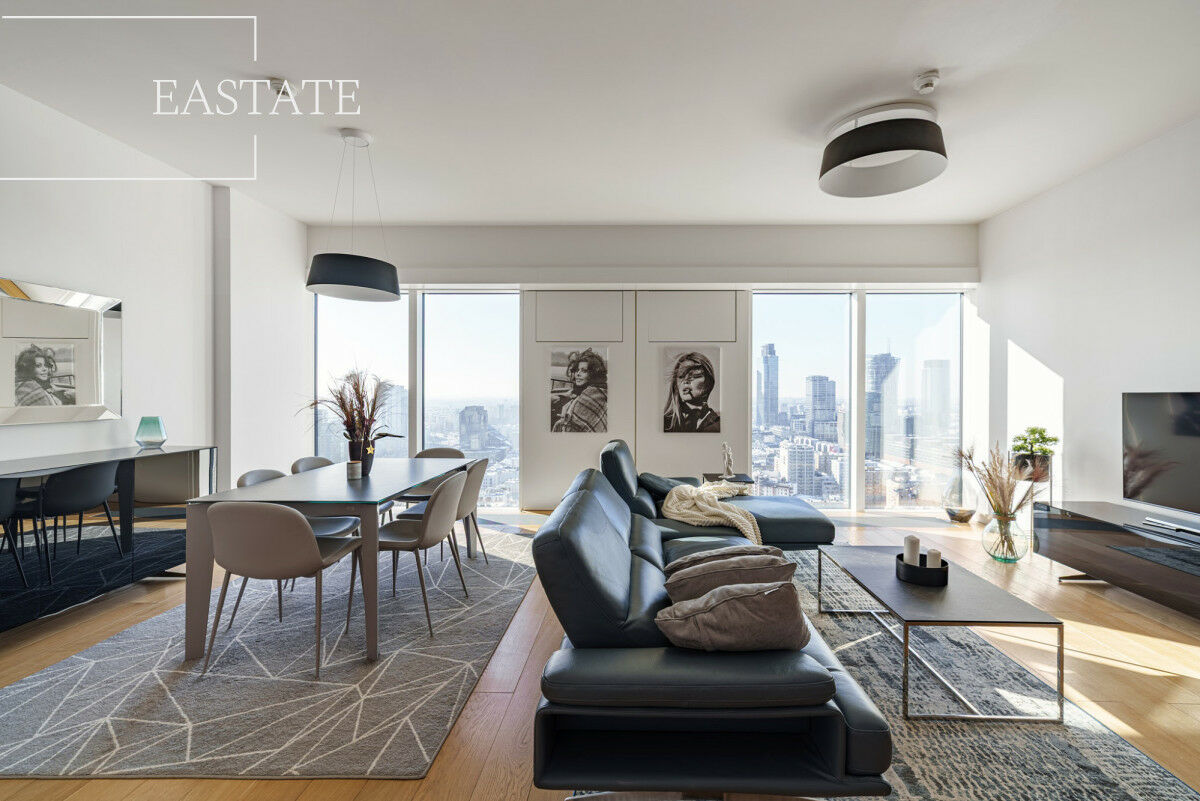 Apartament o powierzchni 99,4 m² zachwyca nowoczesnym designem, doskonałym doświetleniem oraz spektakularnym panoramicznym widokiem na panoramę miasta.