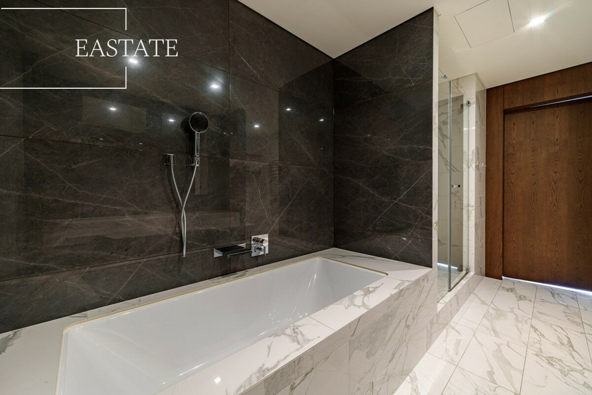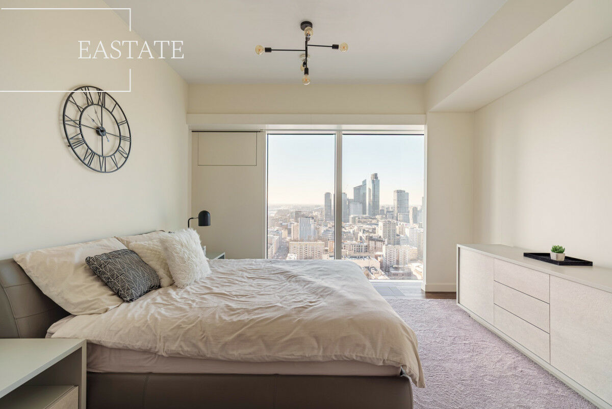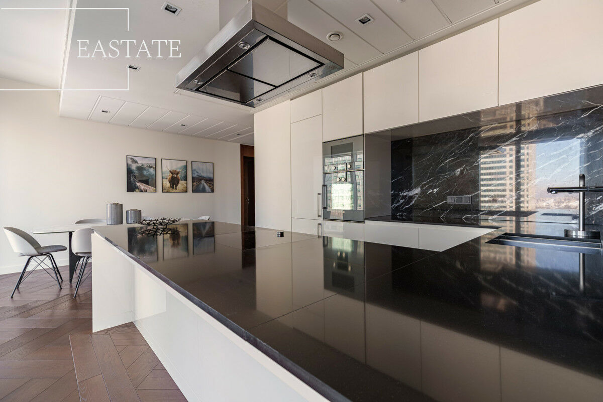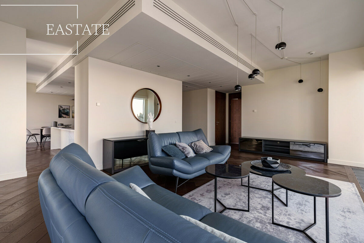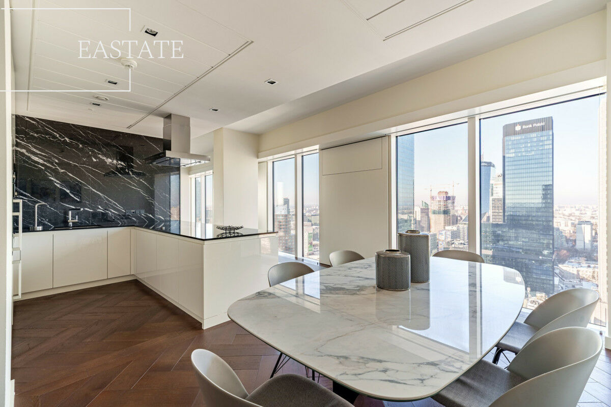 Apartament o powierzchni 170 m² zachwyca nowoczesnym designem, doskonałym doświetleniem oraz spektakularnym panoramicznym widokiem na panoramę miasta.
