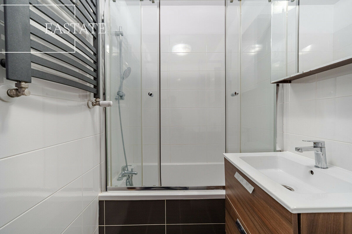 - Łazienka — wanna z parawanem, umywalka z szafką i pralka