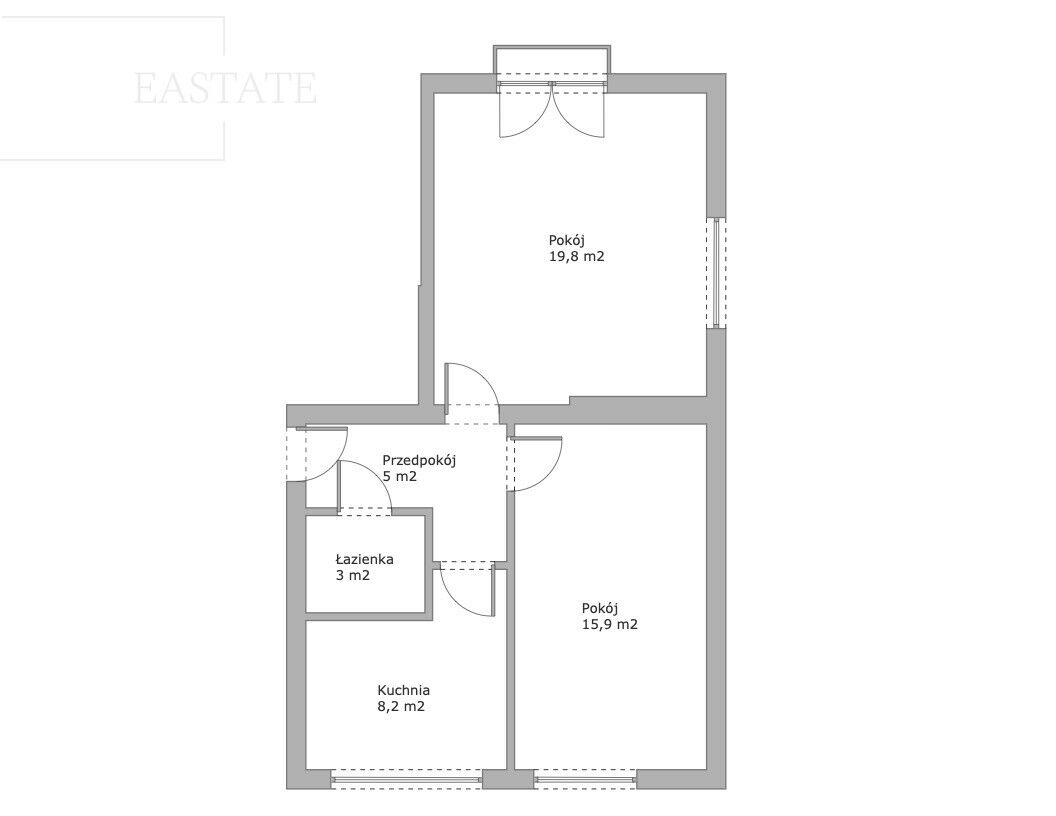 Układ mieszkania jest klasyczny i czytelny, z oddzielną kuchnią i dwoma niezależnymi pokojami.