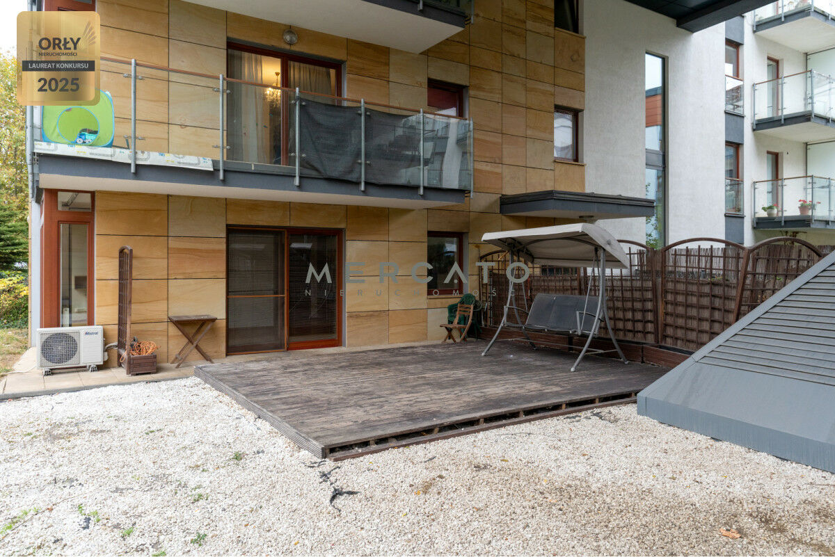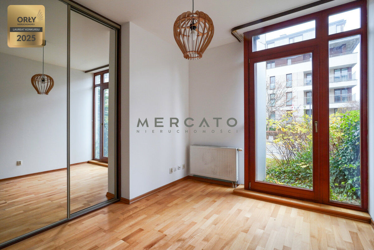 Mieszkanie posiada atrakcyjny rozkład z otwartą przestrzenią, dzięki czemu świetnie nadaje się również na biuro lub gabinet - idealne dla osób pracujących zdalnie lub prowadzących działalność wymagającą spokojnej, reprezentacyjnej przestrzeni. Z salonu i sypialni wyjście na 180-metrowy ogródek. Zabudowa kuchenna wraz ze sprzętem AGD oraz większość mebli może pozostać w cenie mieszkania. Budynek wykończony w dobrym standardzie, dostosowany dla osób niepełnosprawnych. Drewniane podłogi. Klimatyzacja w pomieszczeniach sterowana indywidualnie.