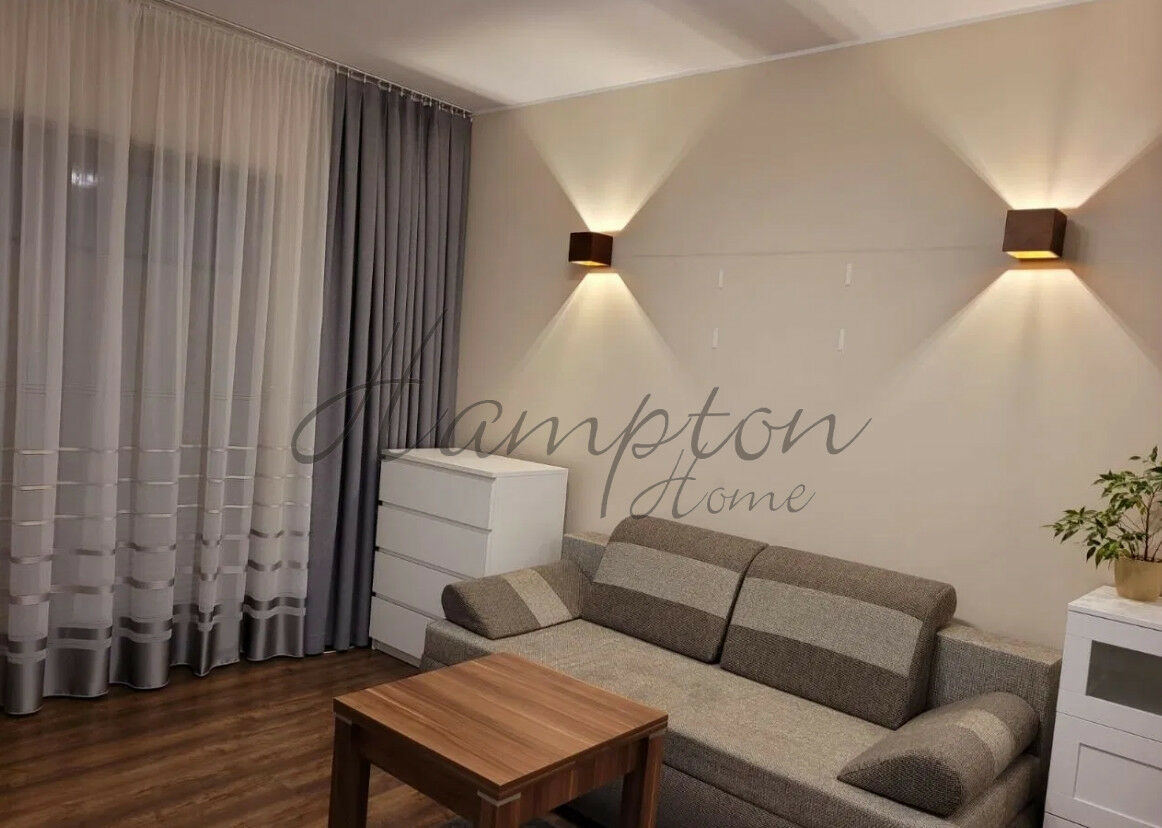 W salonie znajduje się duży, Samsung Smart TV 50" z nagłośnieniem JBL (soundbar, subwoofer), wygodna sofa, którą można rozłożyć, stolik kawowy i dwie komody z szufladami. Salon jest dobrze oświetlony, posiada duże okno z drzwiami balkonowymi, lampę wiszącą oraz kinkiety tworzące nastrojowy klimat. Duży balkon, wraz z meblami balkonowymi, jest dodatkowym atutem.