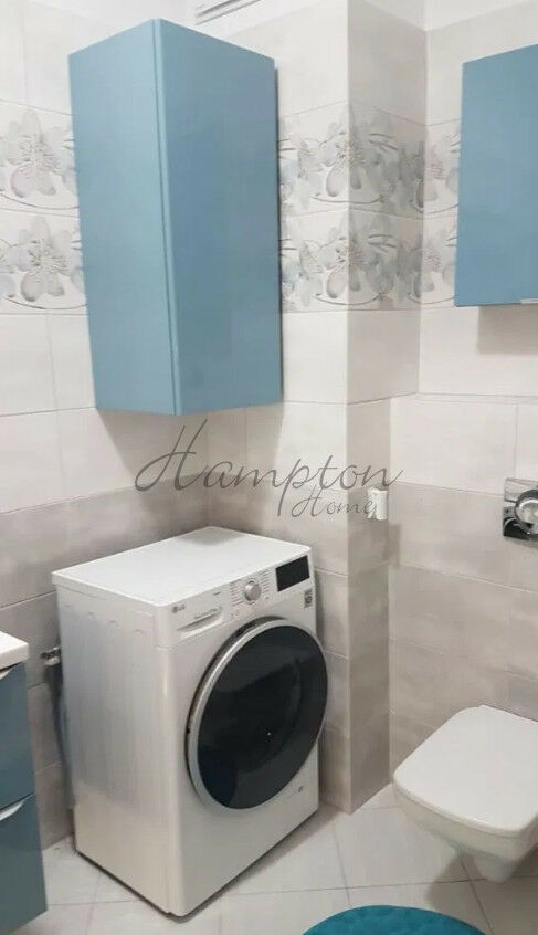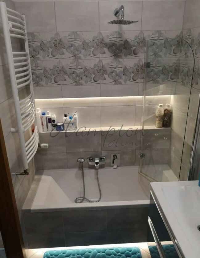 Łazienka funkcjonalna z meblami łazienkowymi, komfortowa wanna z deszczownicą, podświetlana ledami, duże lustro, nowoczesna pralka LG z dużą ilością funkcji.
